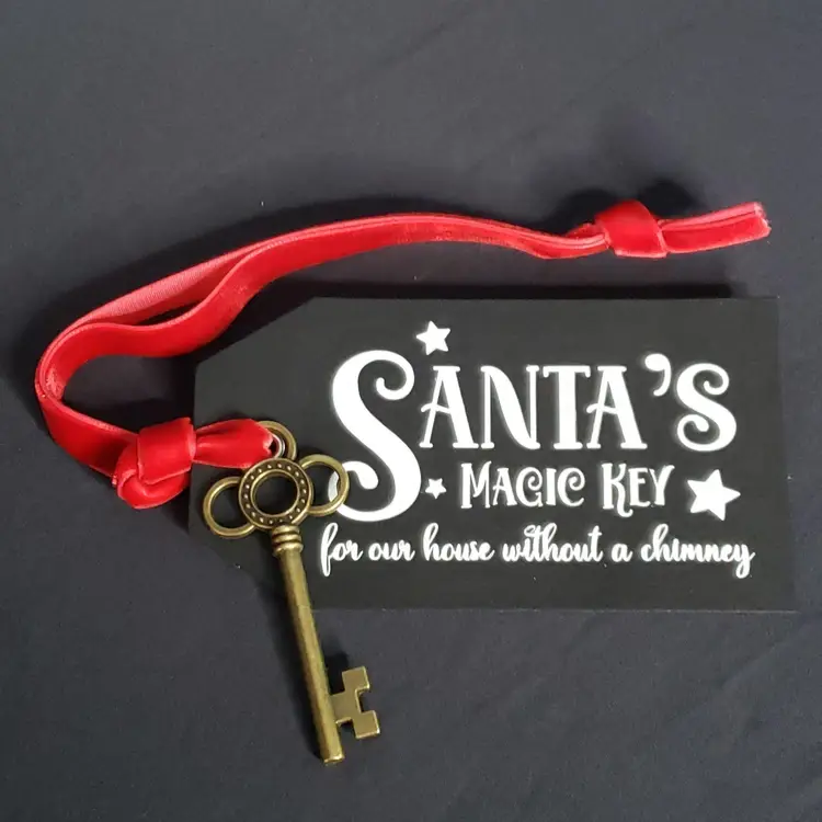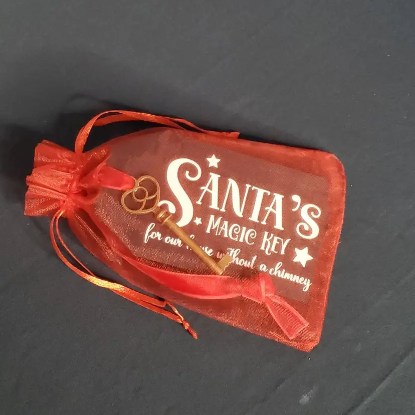 Hang on the door knob on Christmas Eve for Santa to deliver presents. Can be Personalization. Santa's Magic Key Tag, Metal Key with red velvet ribbon.