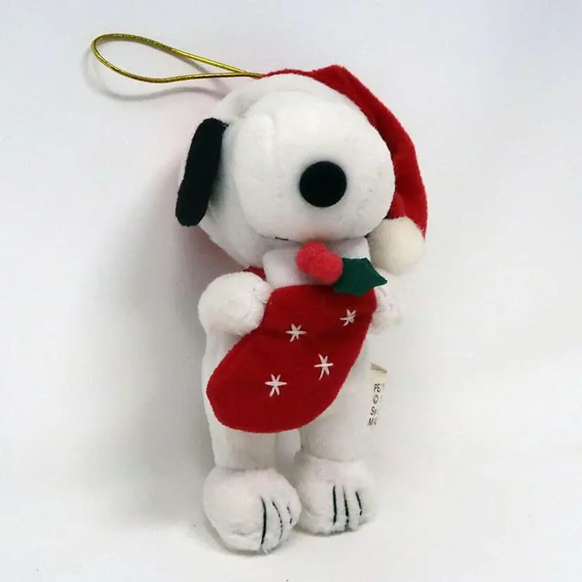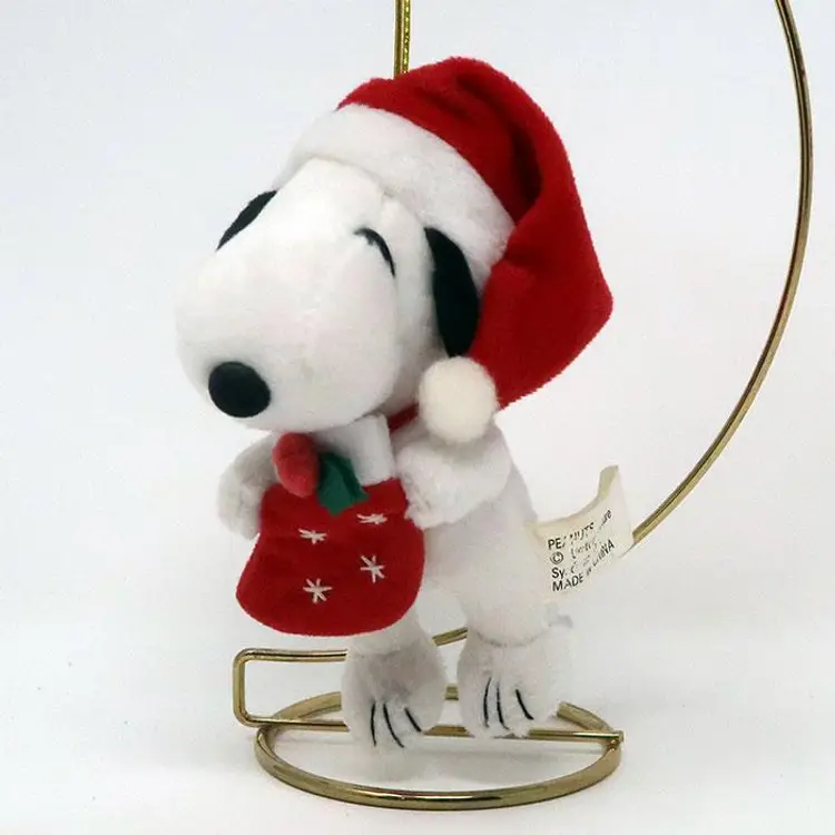 Celebrate the holidays with this adorable Santa Snoopy holding Christmas Stocking Plush Ornament. Snoopy is dressed in a festive Santa hat and holding a red stocking, ready to bring cheer to your Christmas tree. A perfect addition for any Peanuts fan's holiday collection. Made by Kurt Adler in the 1990s, this Peanuts ornament has a slight discoloration on the bottom of Snoopy's foot, but is otherwise in great condition.