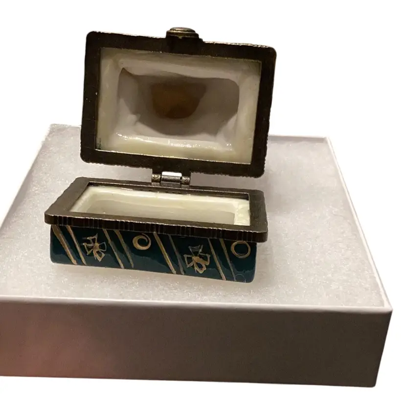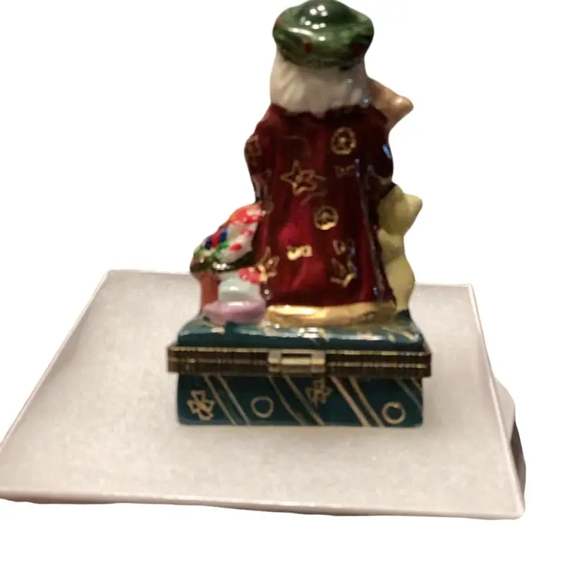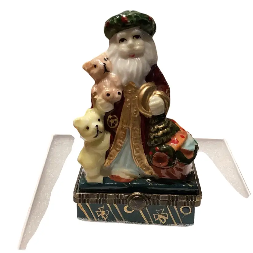 Adorable little trinket box Santa with the two teddy bears and presents under the tree measures approximately 3 inches tall