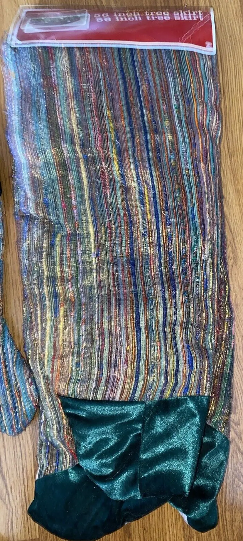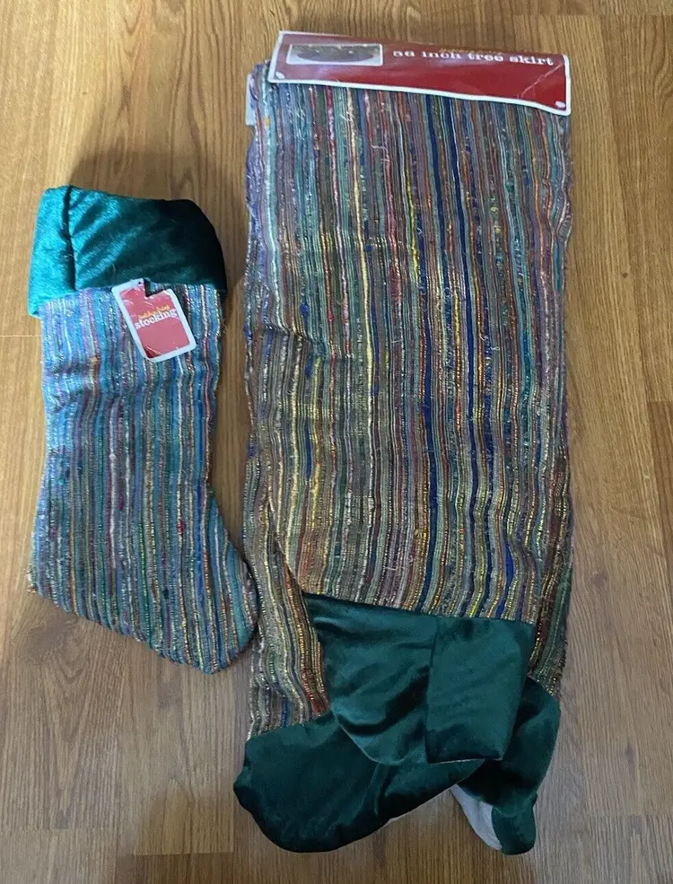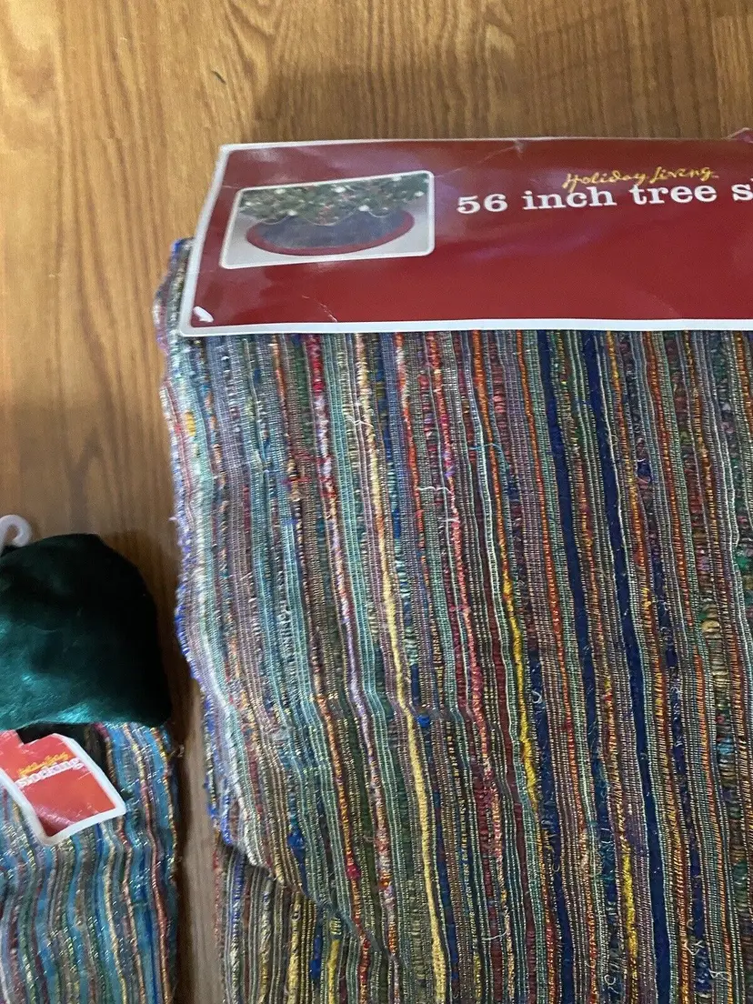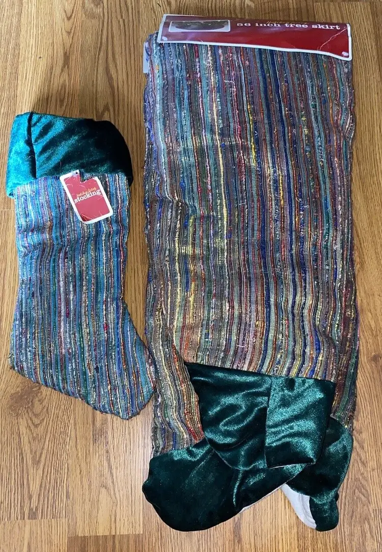 Pattern: Striped Shape: Round Occasion: Christmas Size: Large Color: Multicolor Set Includes: Tree Skirt Material: Polyester, Velvet Year Manufactured: 2002 Item Length: 56” Brand: Santas Best Personalize: No Type: Tree Skirt Theme: Holiday Number of Items: 1