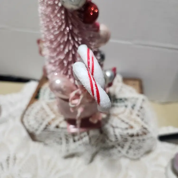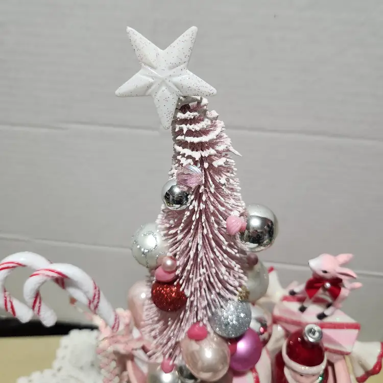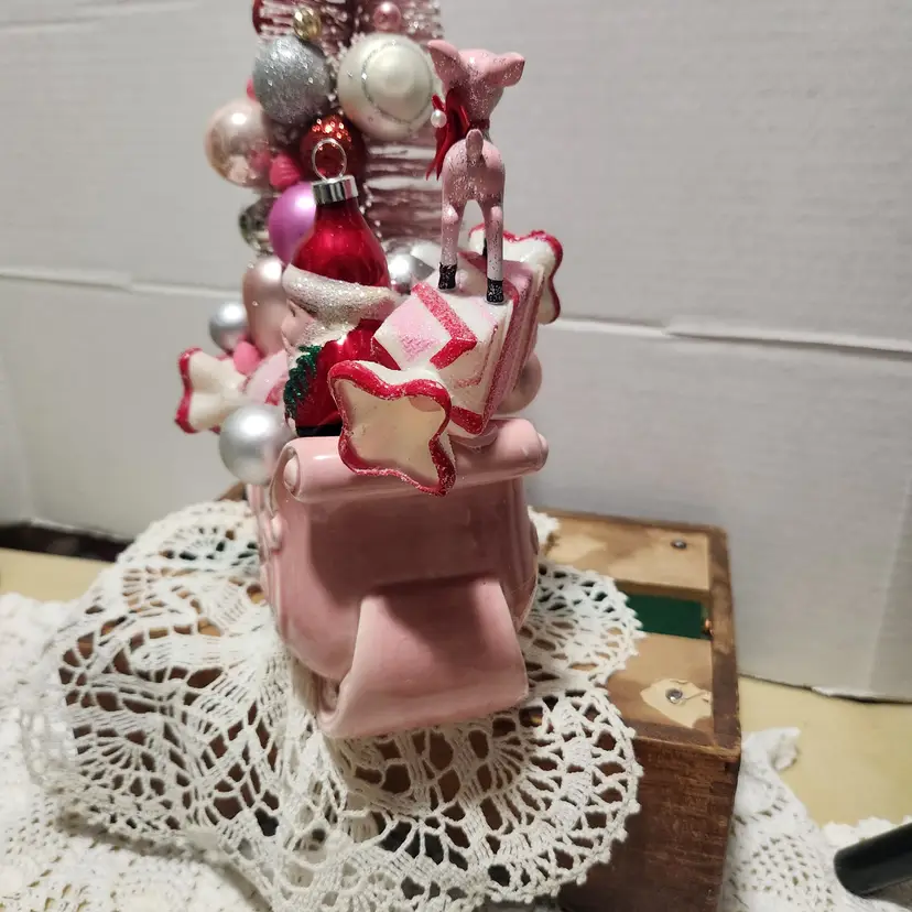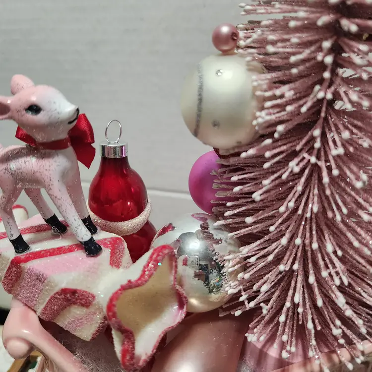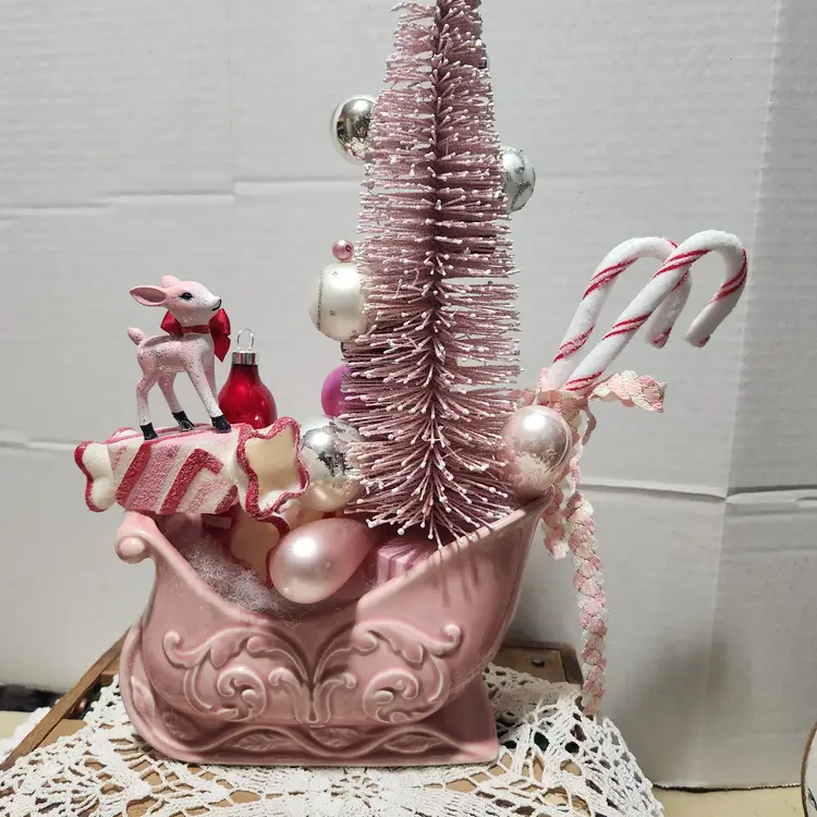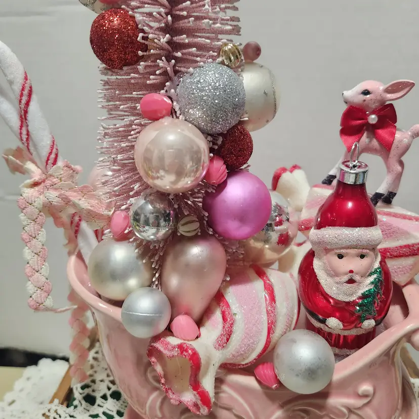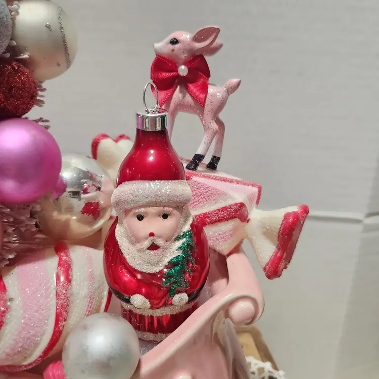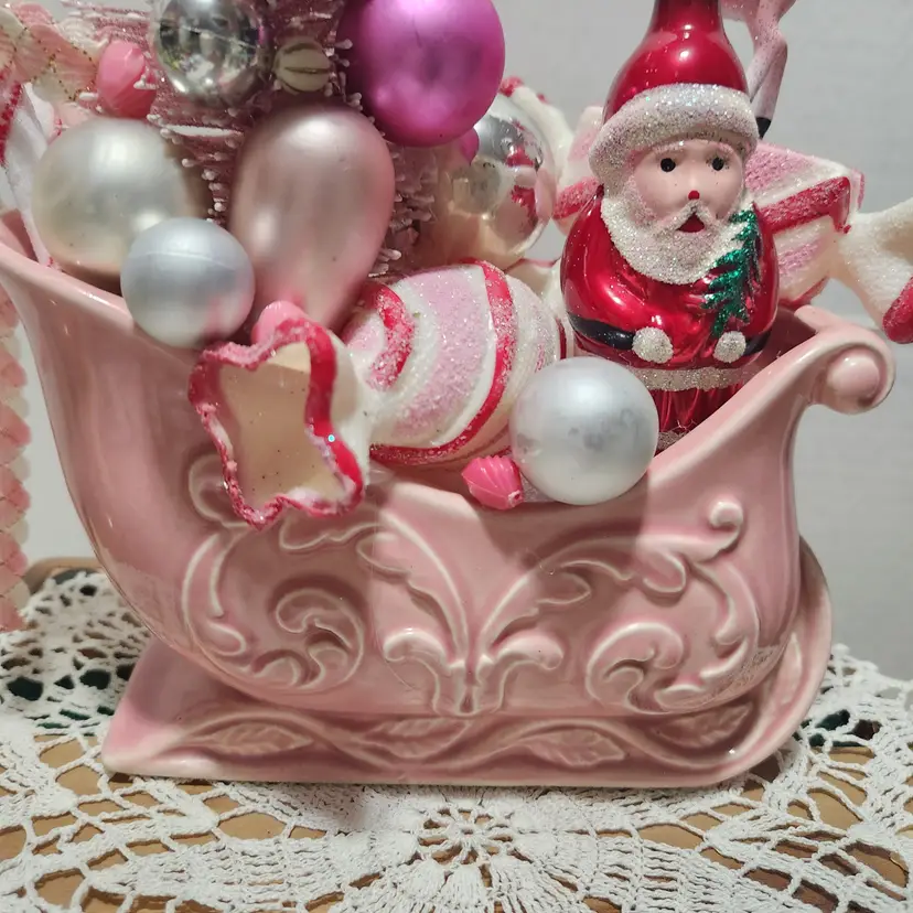 A vintage pink sleight full of delights! Candy canes, bon bons and more! A blown glass Santa drives while the pink deer rides along side. 12 inches tall
