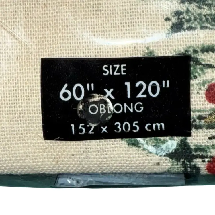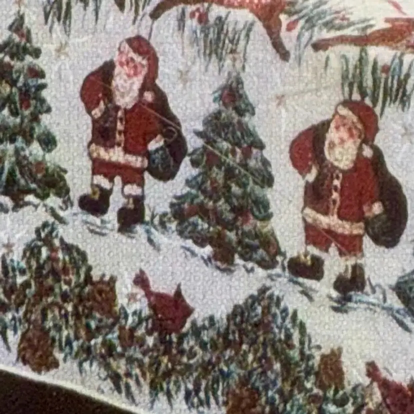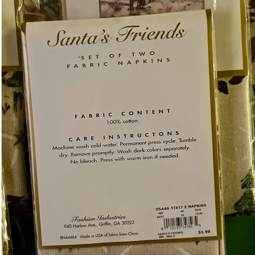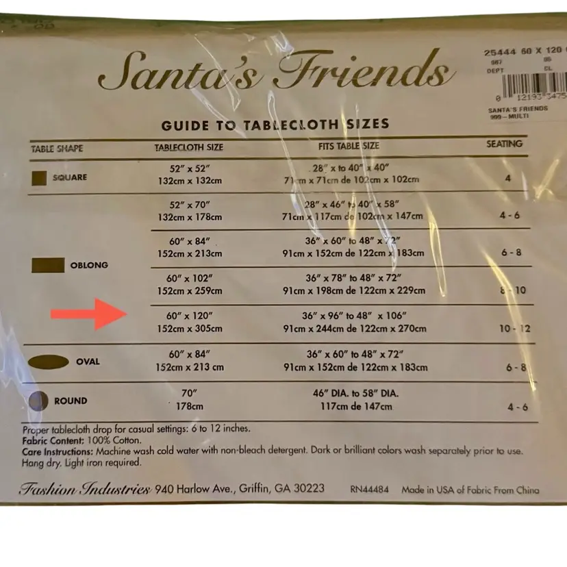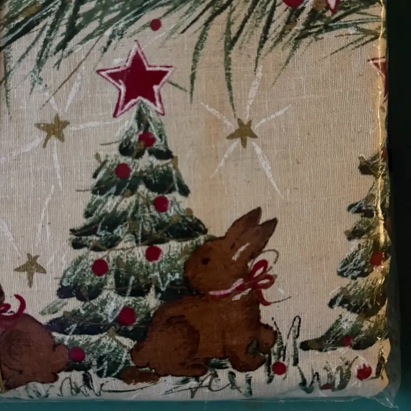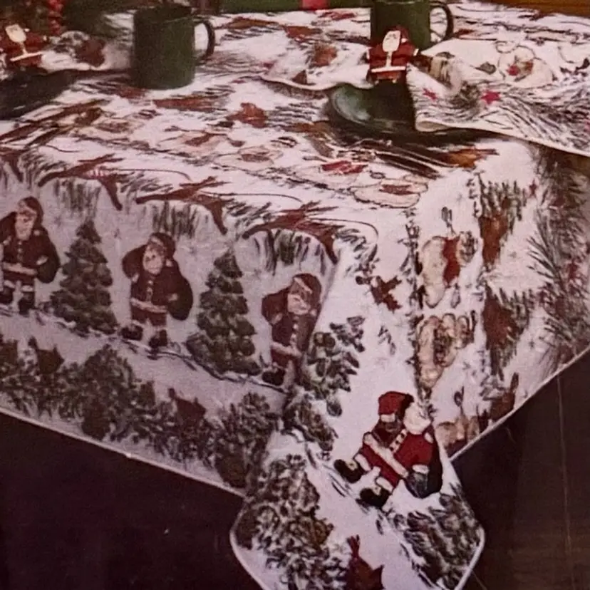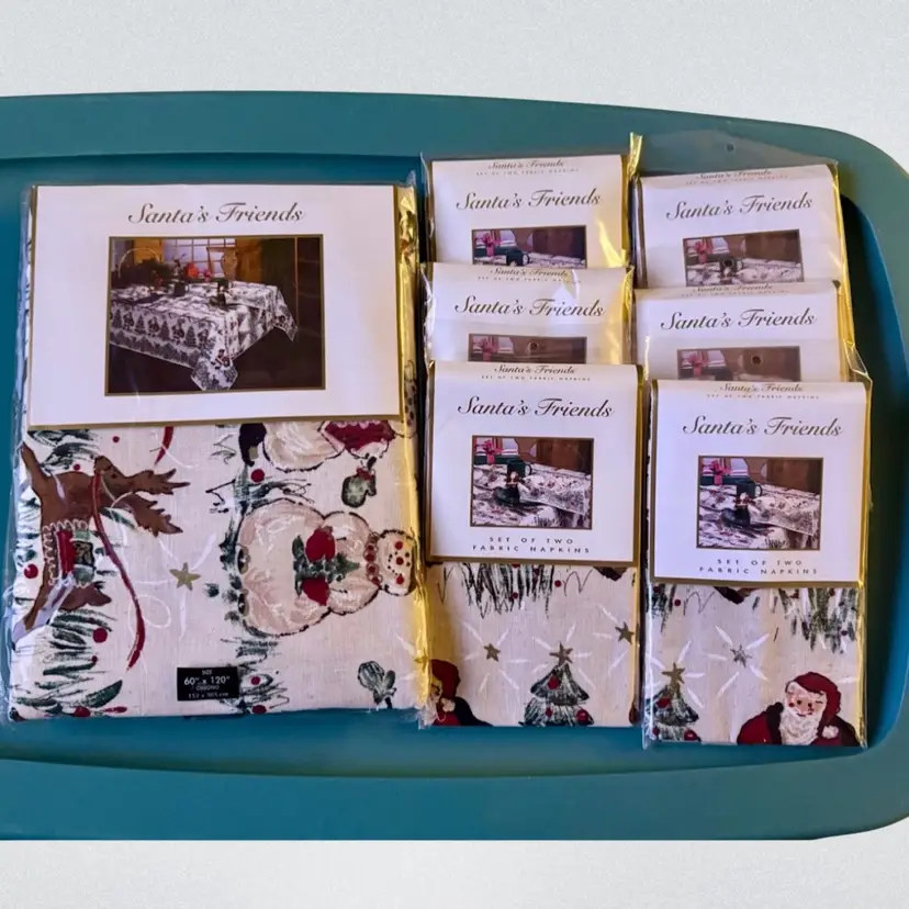 Santa’s Friends Oblong Table Cloth 60x120 & Napkins (12) 100% Cotton. Off white background, green, red, white, and brown. Santa•Snowmen•Bunnies•Deer•X-Mas Trees.