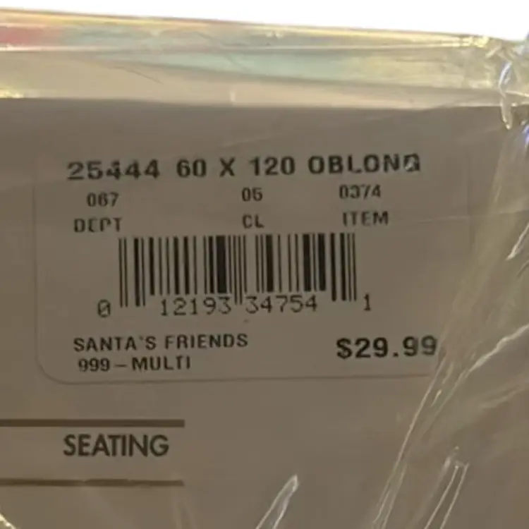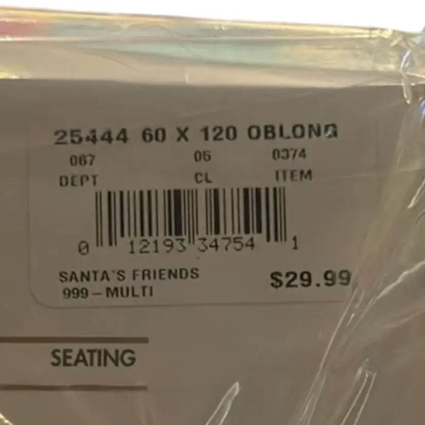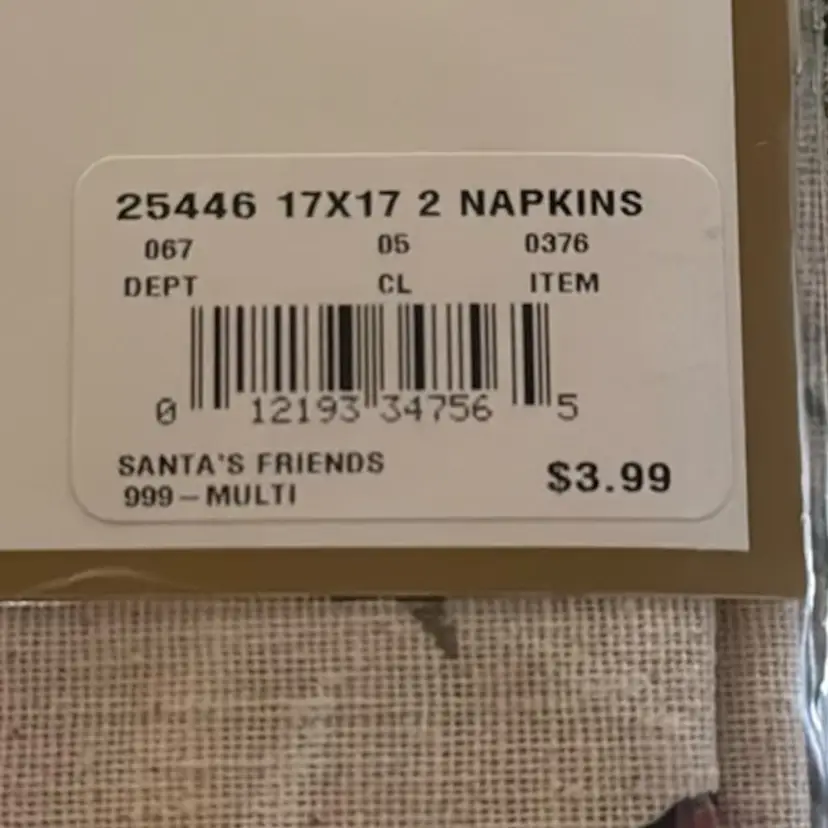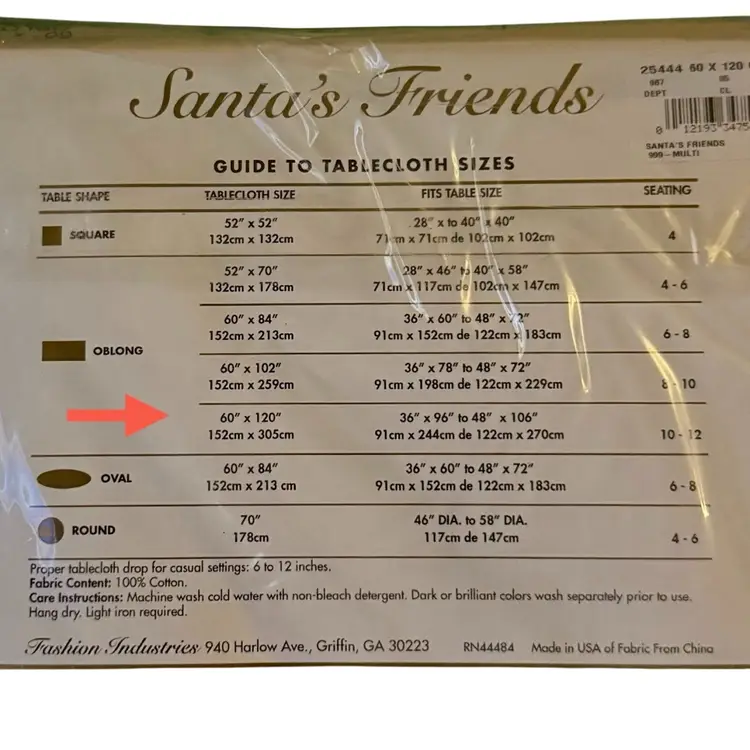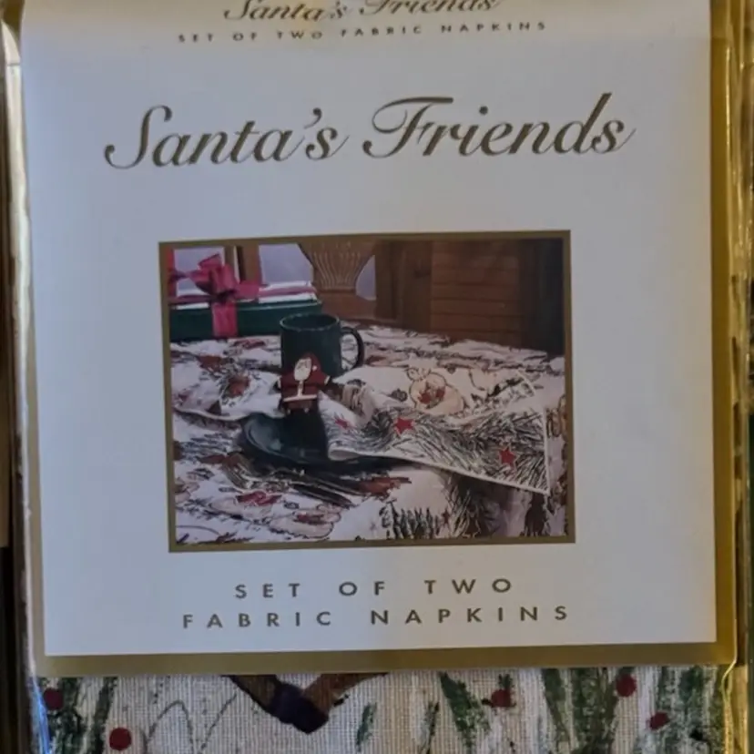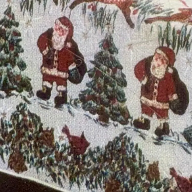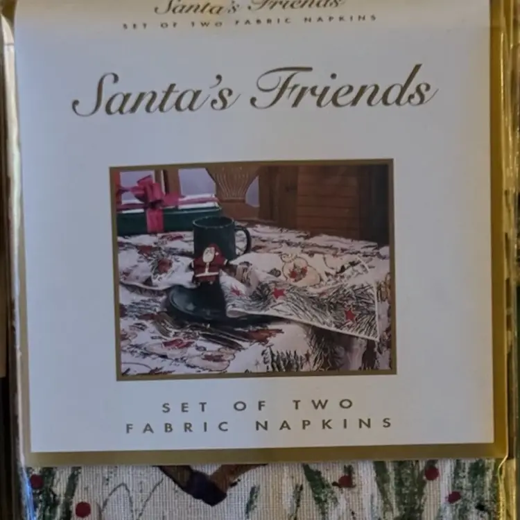 Santa’s Friends Oblong Table Cloth 60x120 & Napkins (12) 100% Cotton. Off white background, green, red, white, and brown. Santa•Snowmen•Bunnies•Deer•X-Mas Trees.