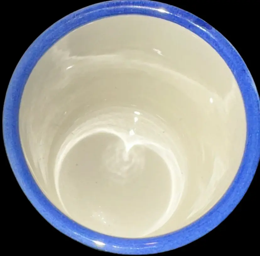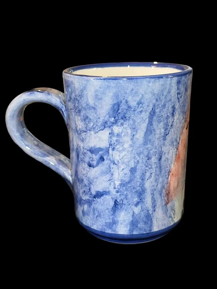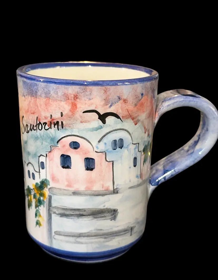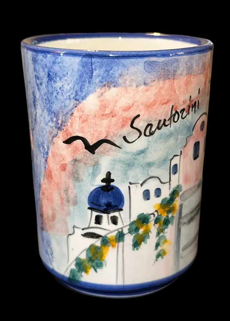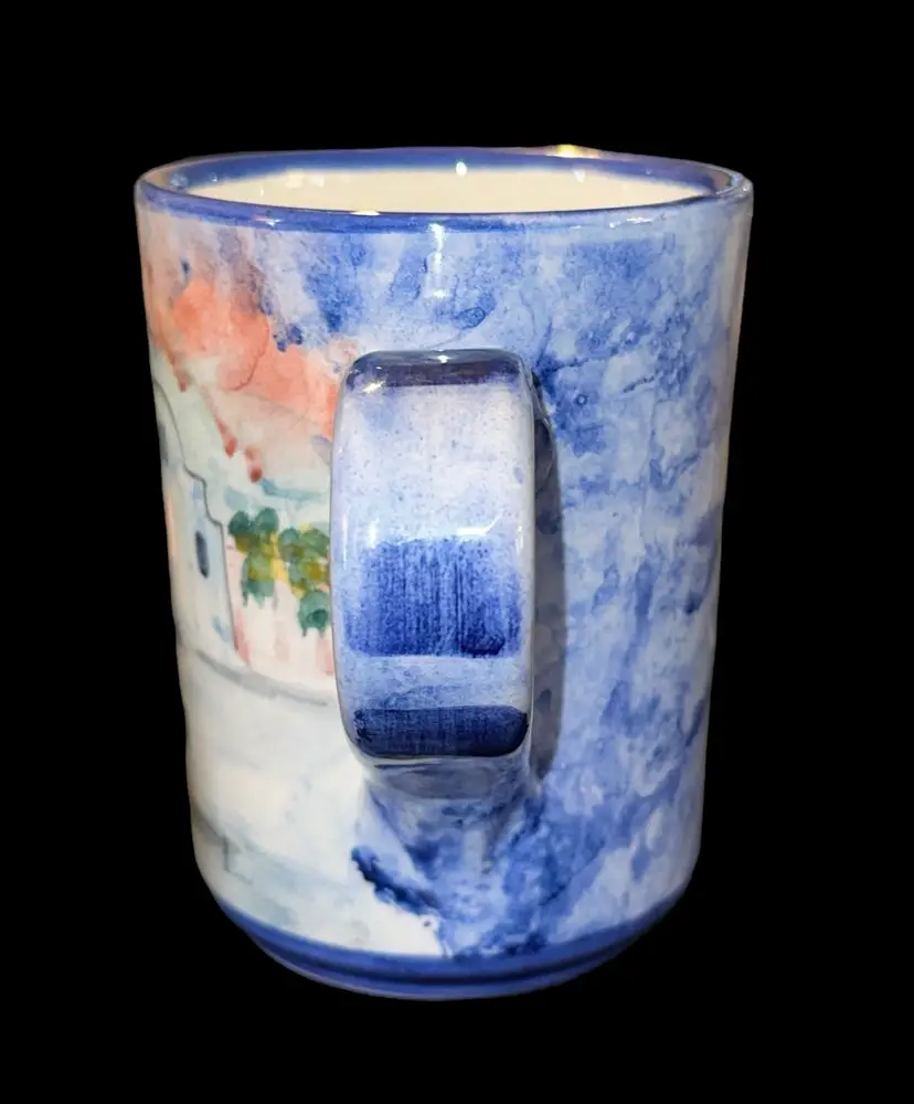 Brand new, beautifully handpainted mug from an artisan in Santorini, Greece. Has blue sponge print on one side, then a beautiful seaside scene handpainted on the other side. Mug measures 4.35” tall and 3.25” across at rim.