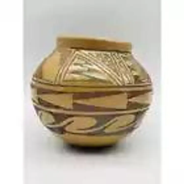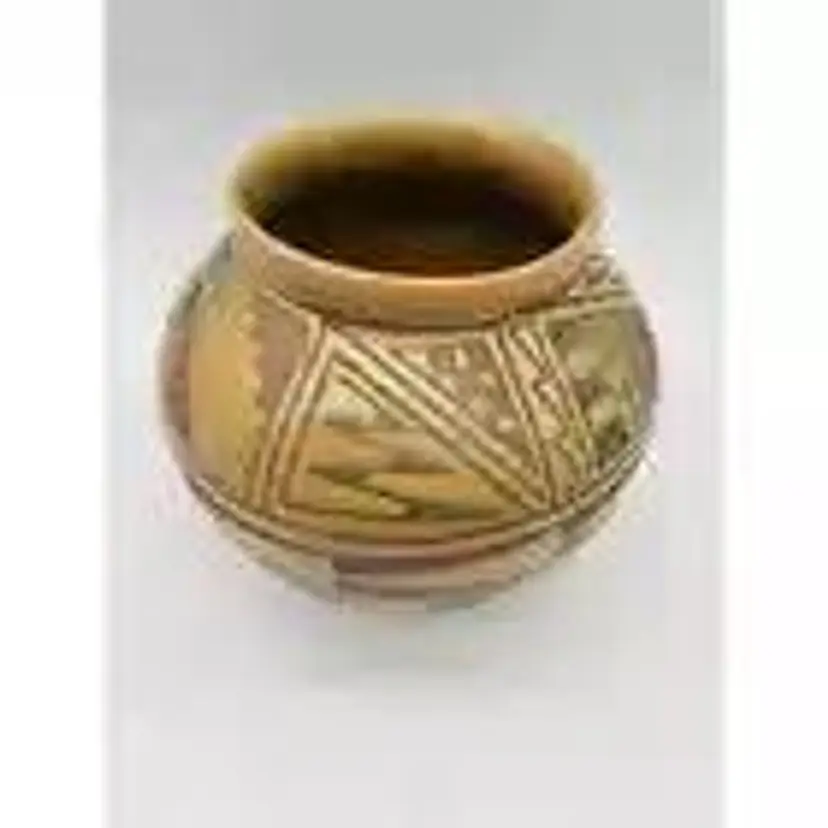 Mata Ortiz pottery by husband & wife team Santos Ortiz & Bertha Chacon, two of the early Mata Ortiz potters. Polychrome ceramic earthenware pottery wobble pot painted earth tone caramel base with black and red geometric design. Measures 5.75” diameter, 3.75” mouth, 5.25” tall.