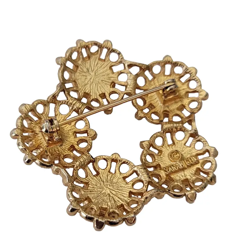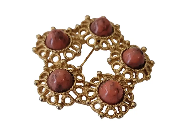 This lovely Vintage Sarah Coventry Brooch is from 1970, known as Valencia. It features a star shape with an open center pin, and the intricately detailed floral motif is in a textured gold tone finish. Five marbled light coral/pink colored bullet Lucite cabochons are set in a gold-tone filigree setting bringing elegance and sophistication to the piece. It measures approximately 1.7 inches in length. It is signed ©SARAH COV on the reverse on the reverse. It features a secured locking pin that functions properly and is in good vintage condition. The pin mechanism fastens securely which is sturdy and secure ensuring that the brooch will stay securely in place when worn.