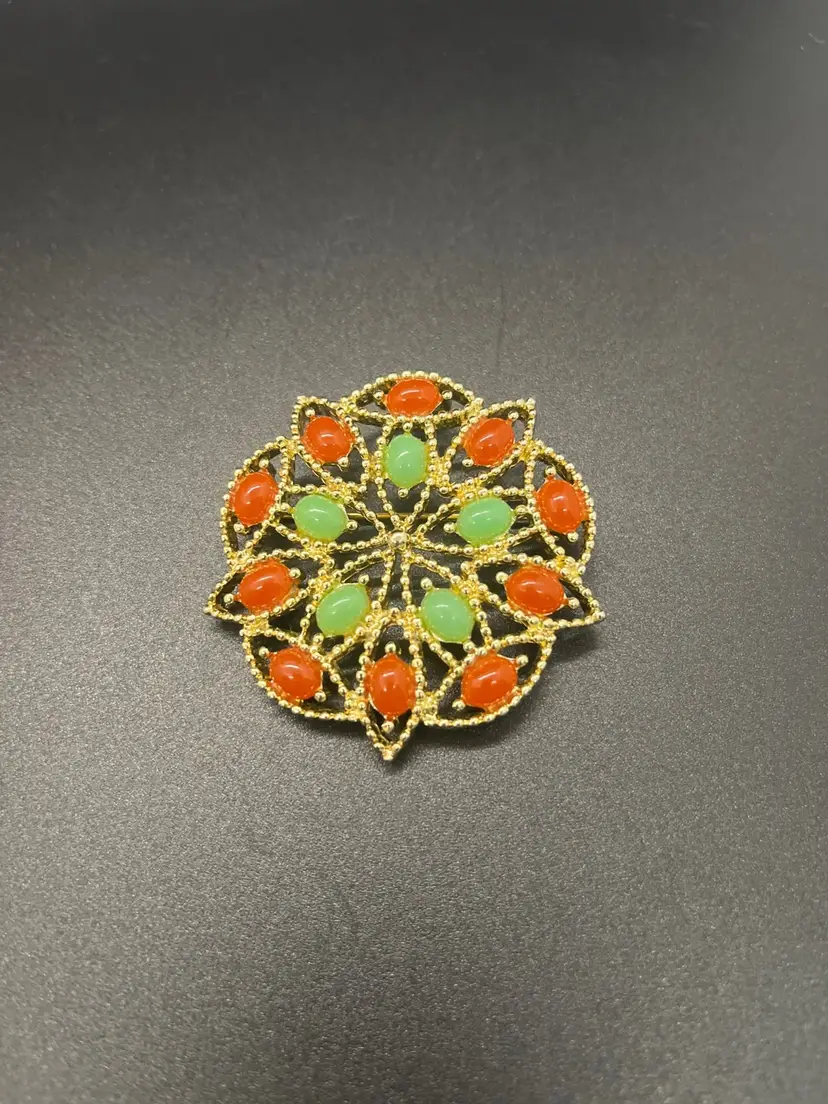 Featuring a striking color palette of pimento red and mint green cabochons set in a tiered, gold-tone starburst frame, this piece offers a bold yet classic aesthetic. Theintricate openwork on the reverse and the clear "©SARAHCOV" hallmark reflect the quality craftsmanship the brand is known for. In excellent vintage condition, this pin is perfect for collectors of Sarah Coventry or anyone looking to add a pop of vintage color to their wardrobe.