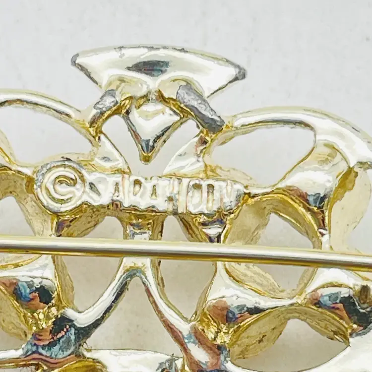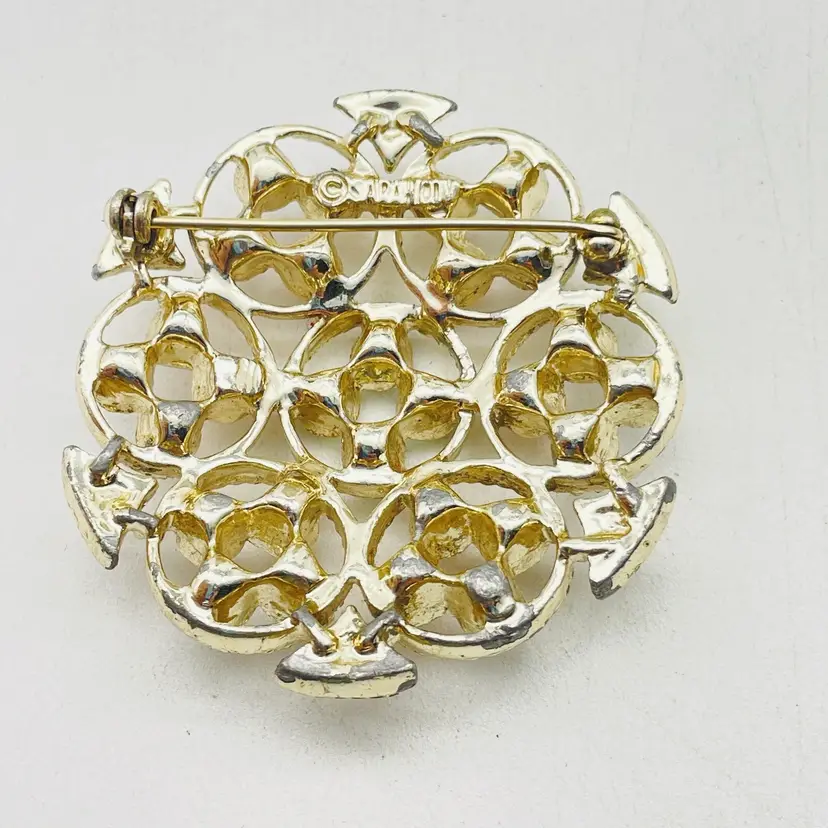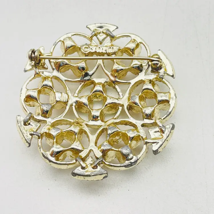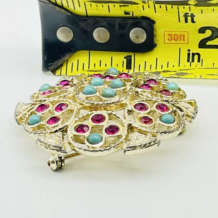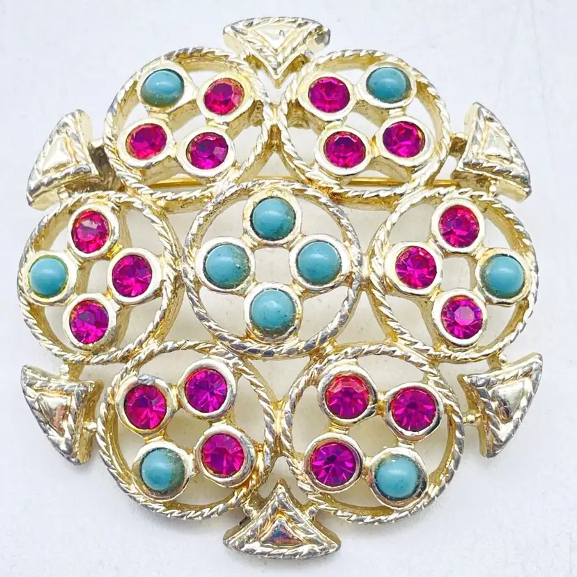 Beautiful signed Sarah Coventry brooch featuring a round gold tone design accented with bright pink rhinestones and turquoise cabochons. A collectible vintage piece with bold retro style. Features Signed Sarah Coventry brooch Gold tone round geometric floral-inspired design Pink rhinestones and turquoise cabochons Secure pin clasp closure Vintage collectible costume jewelry Approx. size: 1.75"