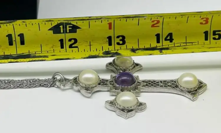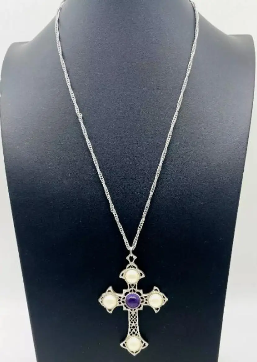 Elegant vintage silver tone cross necklace featuring faux pearls and a striking amethyst center. Perfect for adding a touch of classic charm to any outfit.