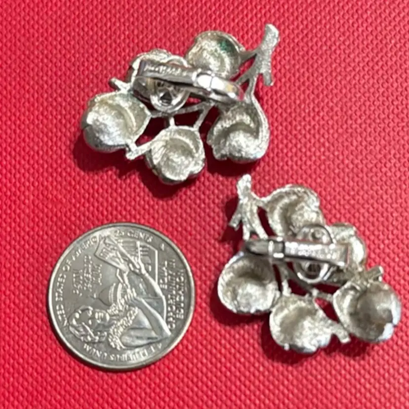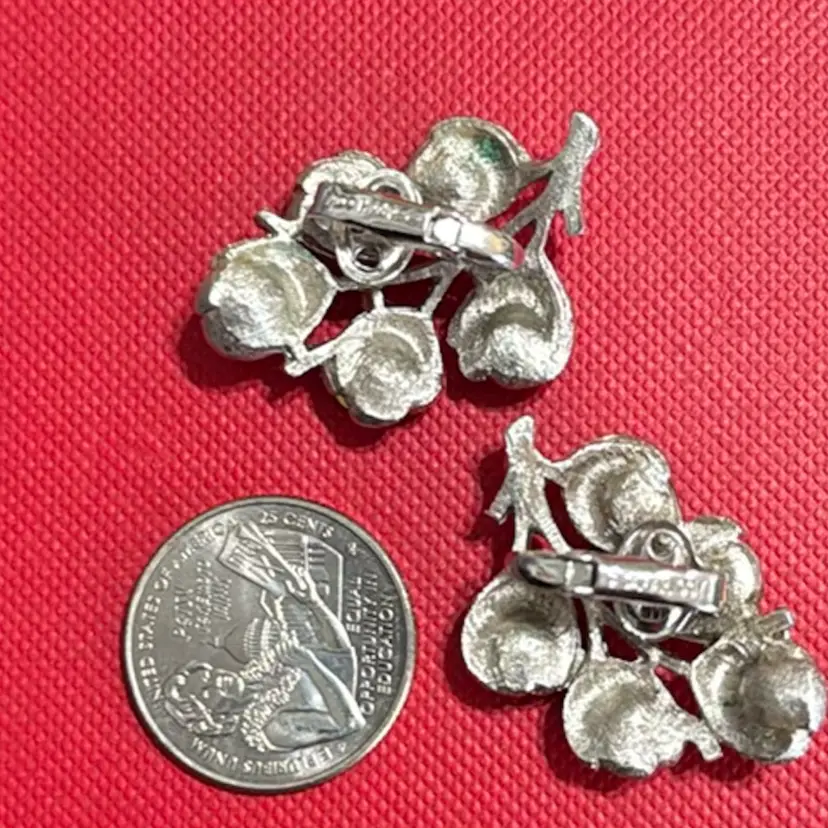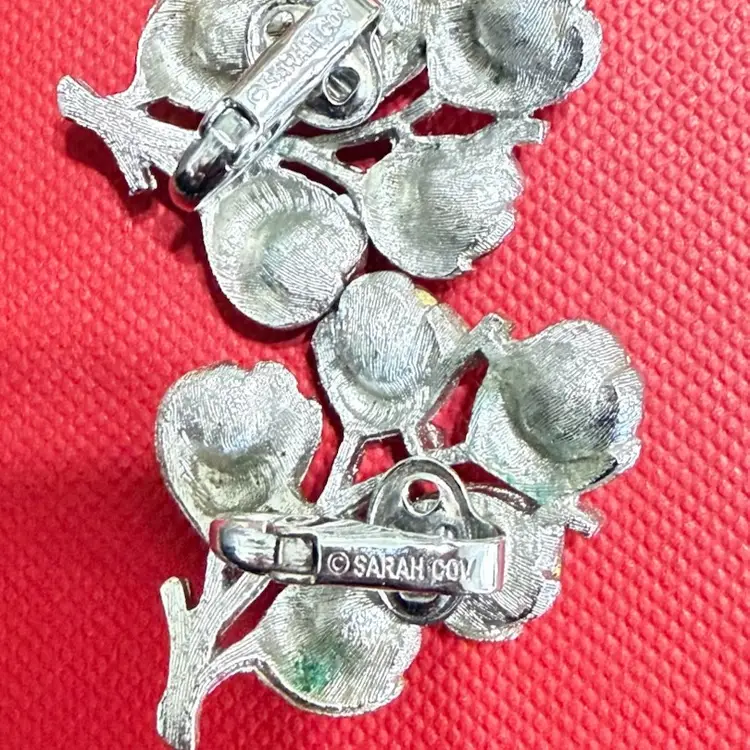 These Sarah Coventry silver toned pink purple wisteria rhinestone clip-on earrings are in very good condition.