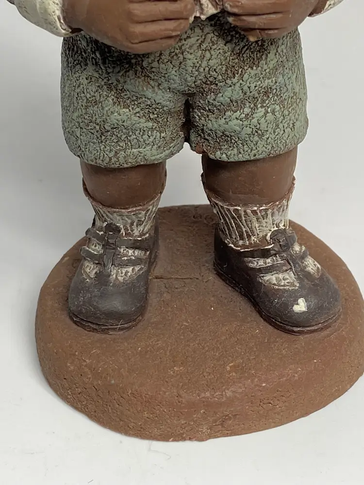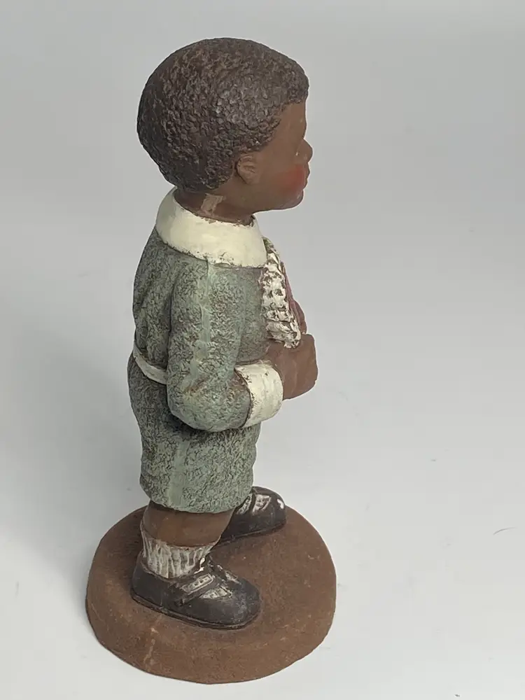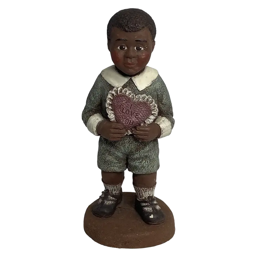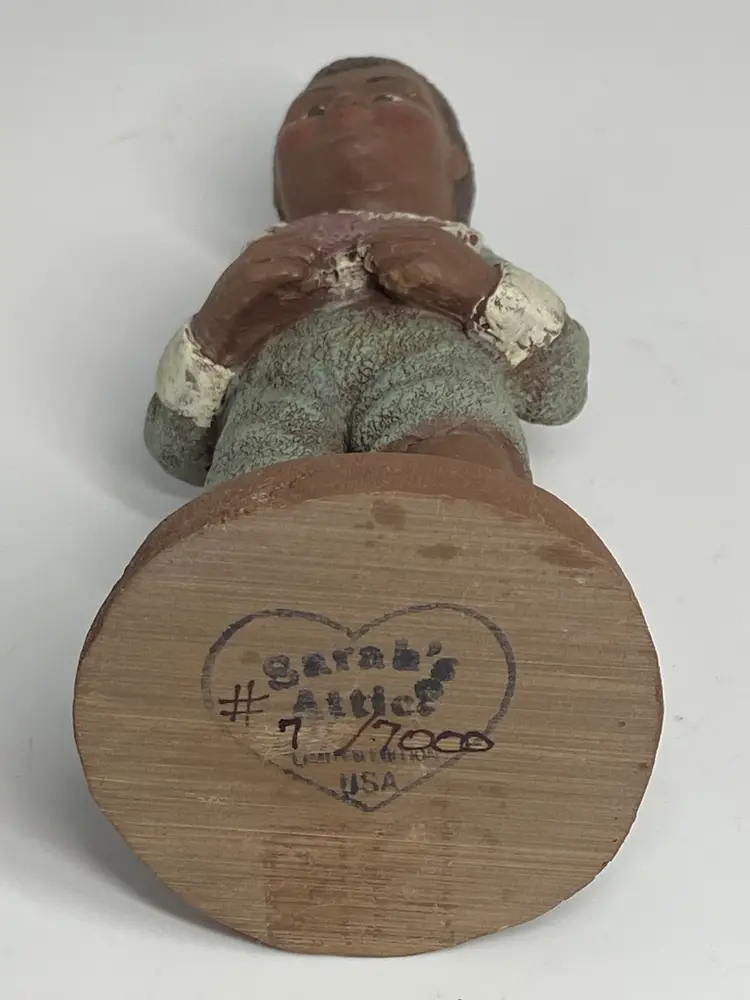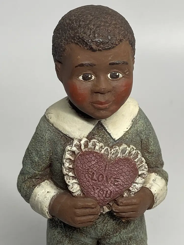 Sarah's Attic Limited Edition Webster figurine is a small, multicolor resin sculpture of an African American Boy with a heart that reads "I Love You". Standing at 5.5 inches tall, this collectible piece is from the late 20th century and is part of the Sarah's Attic collection. The figurine comes unboxed and is a limited edition item, making it a unique and special addition to any room's decor. Made in the United States, this matte-finished figurine weighs 3 oz and is perfect for all occasions.