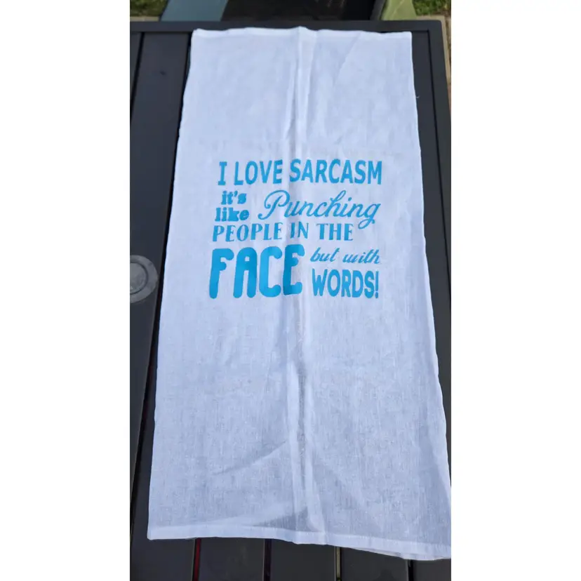 White kitchen towel with a funny sarcastic quote: 'I love sarcasm, it's like punching people in the face but with words!' Perfect for adding humor to your kitchen decor. 100% cotton flour sack towel, permanent vinyl design.