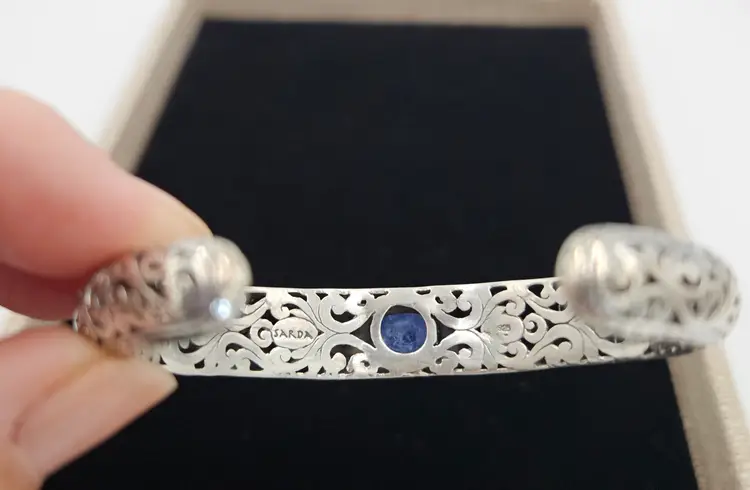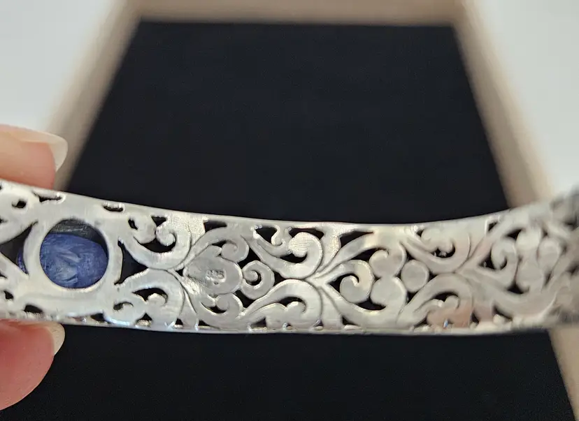 Show stopper cuff bracelet marked 925 Sarda. Measures 6 3/4 to 7 inch wrist. Not tested. 34 grams. Width is 1/2 inch.