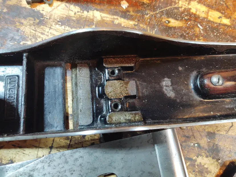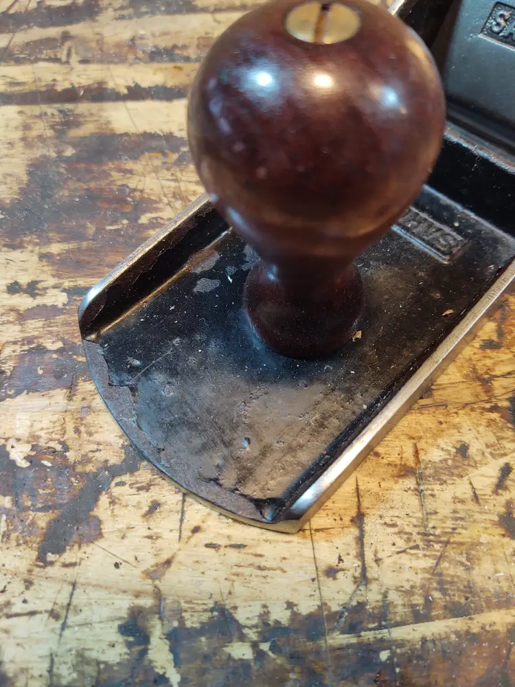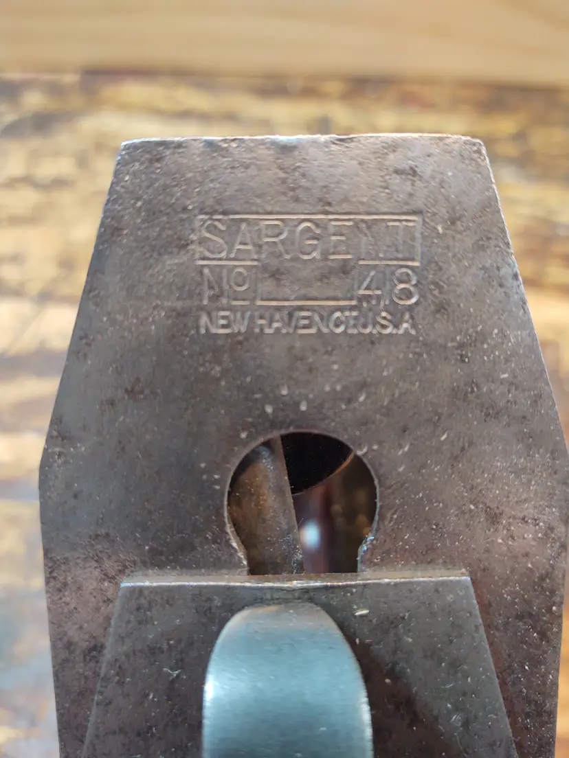 Sargent #418 Type 5 Fore Plane . Length: 18 inches Cutter Width: 2⅜ inches . Sharpened with a slight camber. . Original japanning. Knob and tote original but refinished, tote has been repaired. . Type study. https://www.timetestedtools.net/sargent-400-series-bench-plane-type-study/ . . (My #418-031323-3)