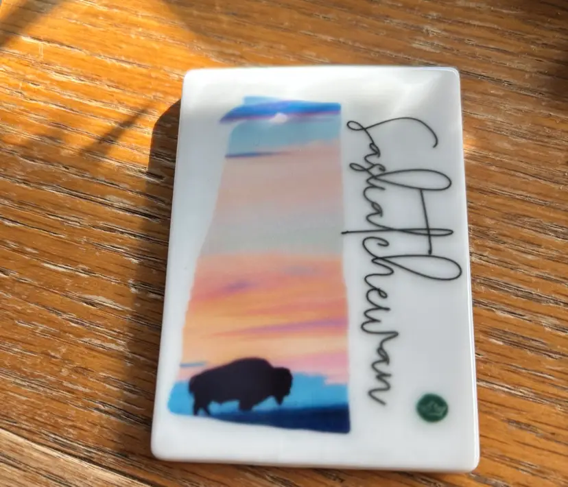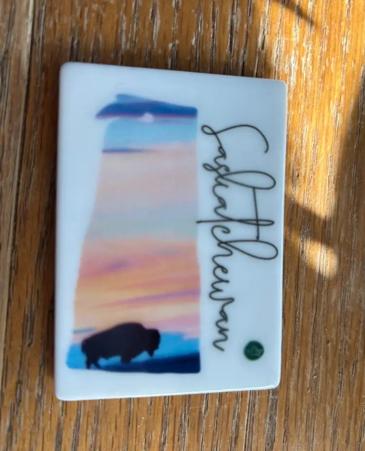 Colorful Saskatchewan souvenir magnet with a bison silhouette. Features a sunset design.