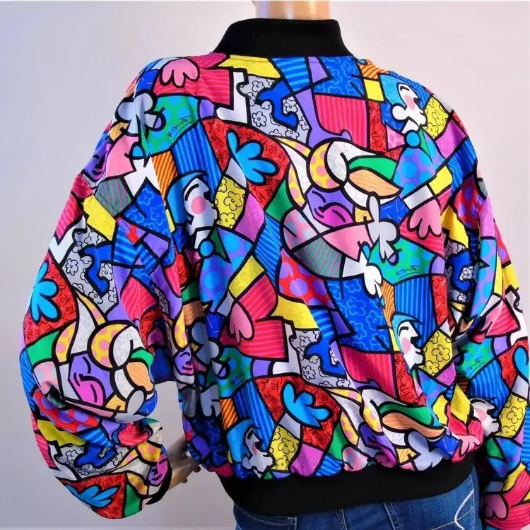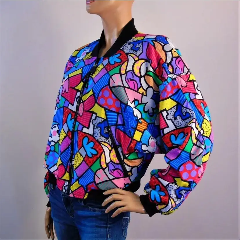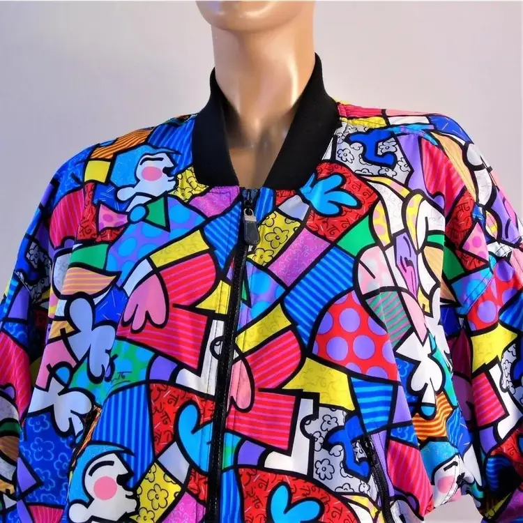 Romero Britto Satin Bomber Jacket Vintage 1990's Pop Art Jacket . Romero Britto Art Print . Knit neckband, waistband and cuffs. Full Zip Front with 2 lower zip pockets . Jersey knit lining .Tagged Size Large . 100% polyester. Assembled in Colombia for Tail. Measurements laid flat : Across Bust 26" / Shoulders 24" / Sleeve 21" / Length 23" . Pre-owned, no rips or stains , no flaws , freshly laundered. Romero Britto - founder of the Happy Art Movement has created a visual language of love, hope and happiness all its own that inspires millions worldwide. Brazilian-born and Miami-made, Britto is an international artist that uses vibrant, iconic imagery and fun patterns to reflect his optimistic view of the world around him.