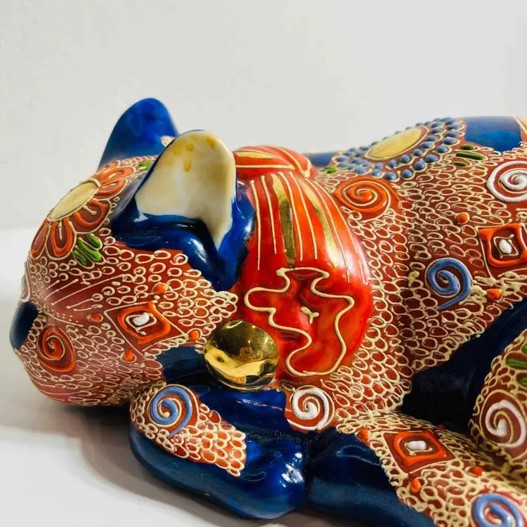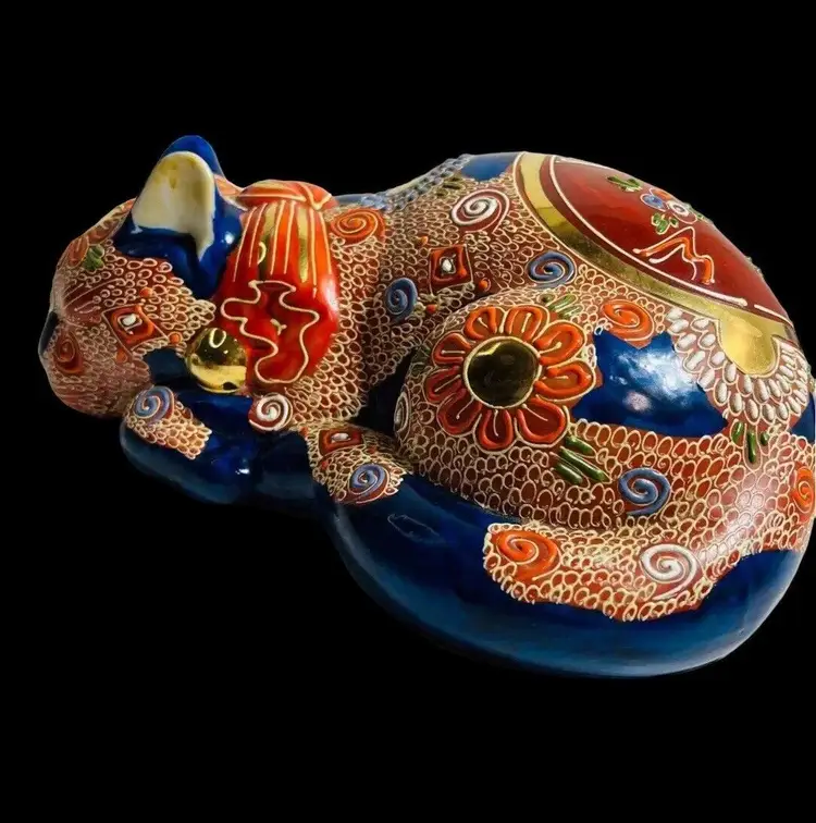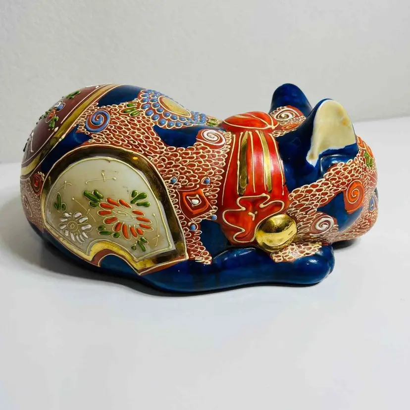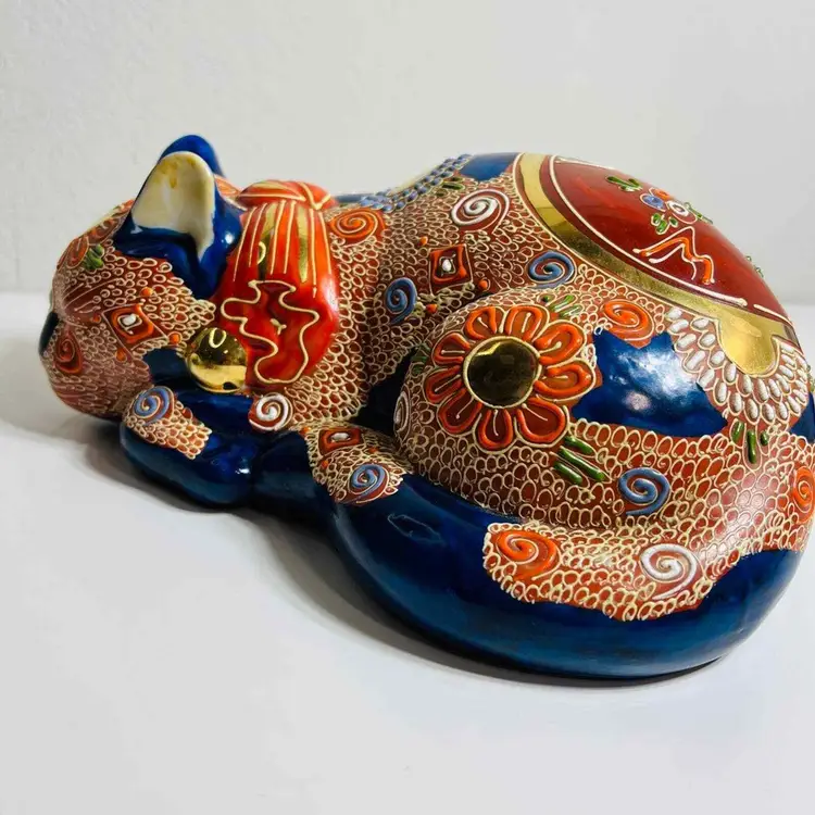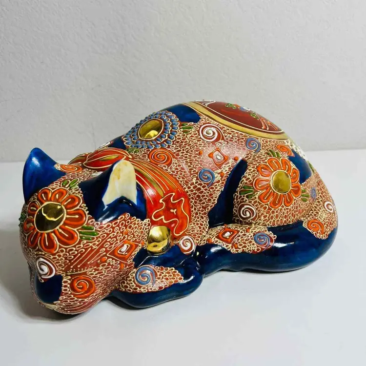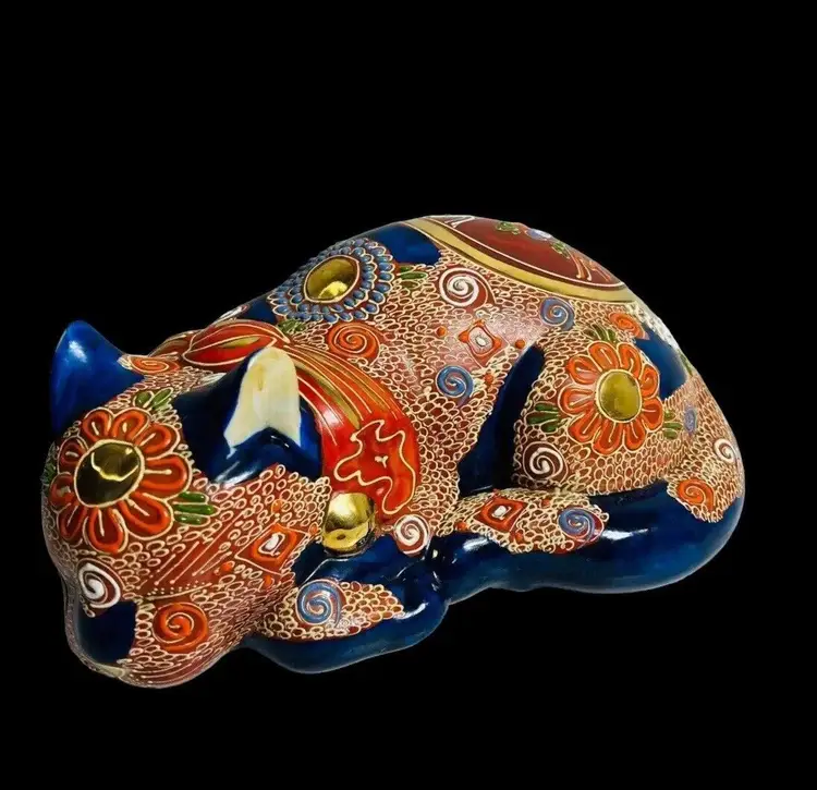 Shape: Cat Character: Laying Cat Size: Large Color: Multicolor Material: Clay, Ceramic Item Length: 10 in Additional Parts Required: No Subject: Cat Personalize: No Brand: Satsuma Mounting: Free Standing, Display Department: Adults Type: Sculpture Item Height: 4 in Style: Asian Theme: Animals Country/Region of Manufacture: Japan Room: Any Room Item Width: 7 in Item Weight: 2 lb Character Family: Kutani “moriage” style