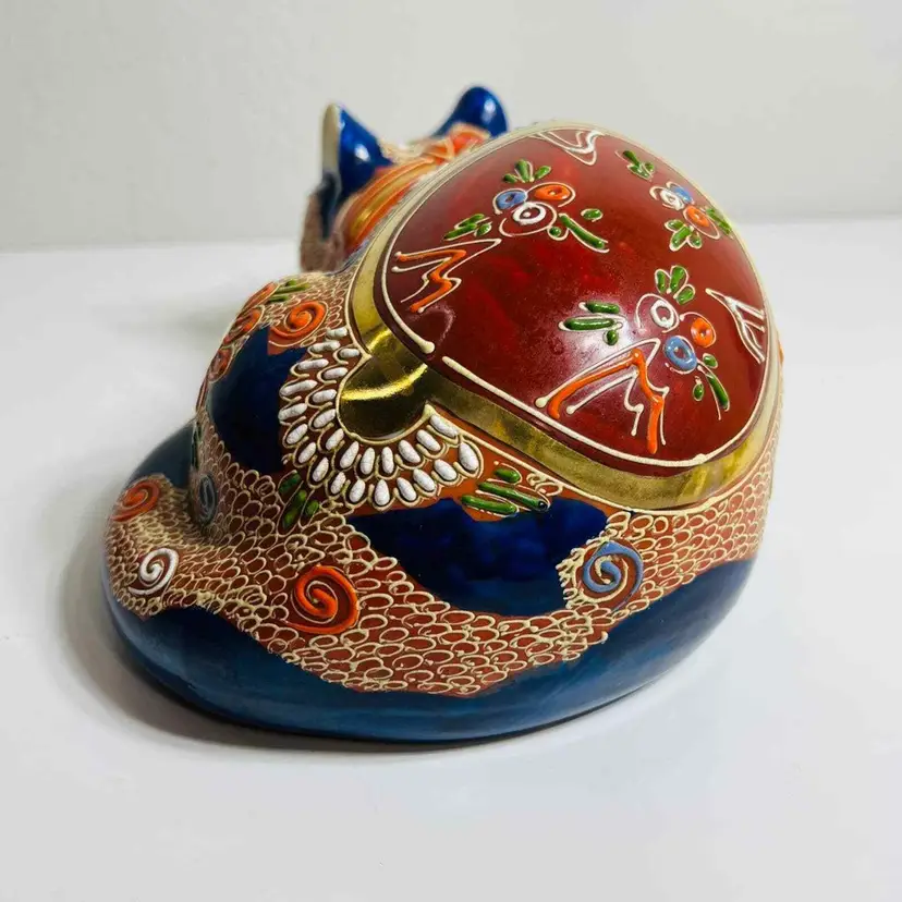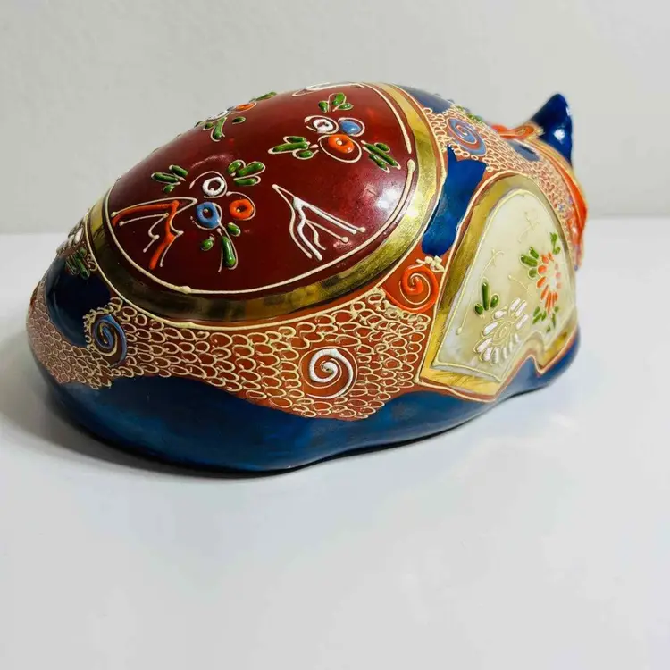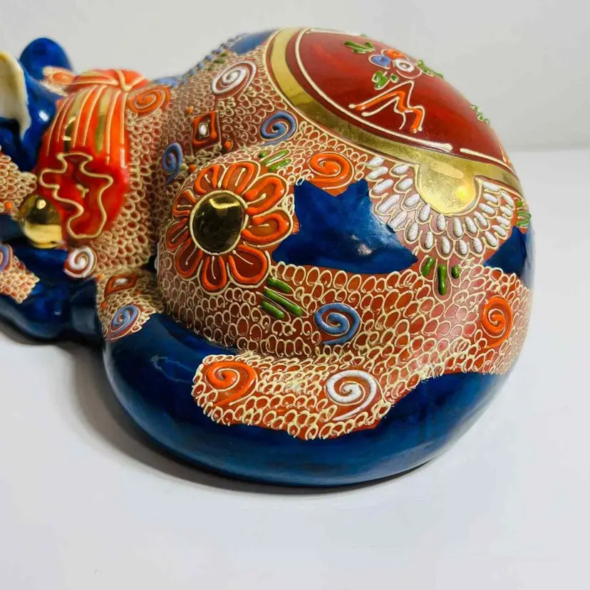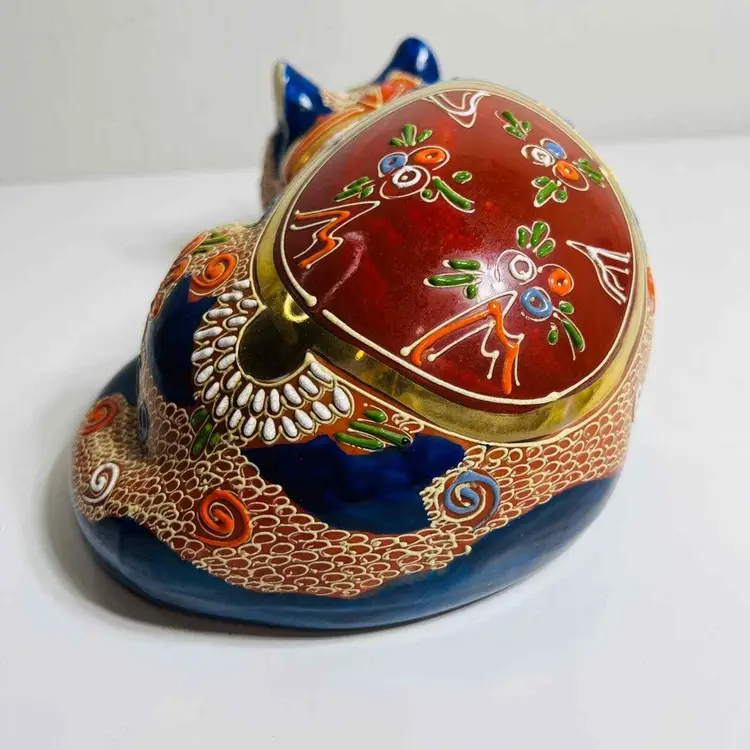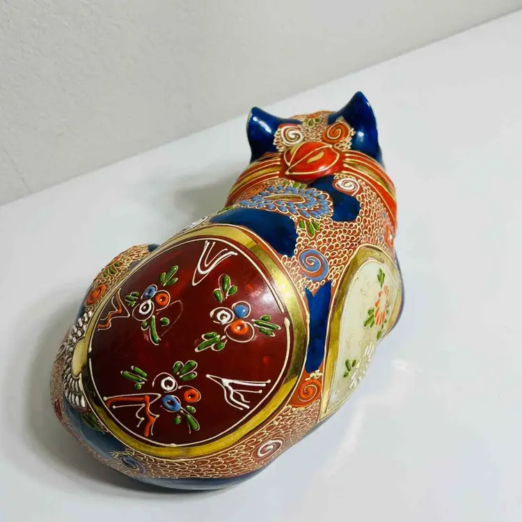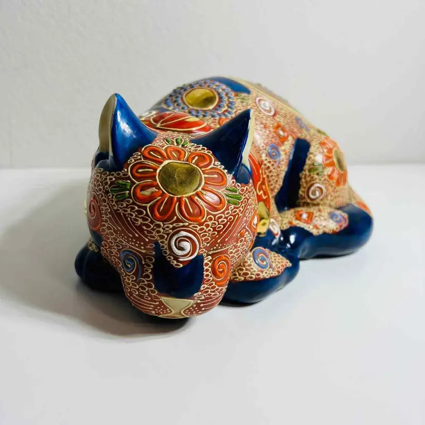 Shape: Cat Character: Laying Cat Size: Large Color: Multicolor Material: Clay, Ceramic Item Length: 10 in Additional Parts Required: No Subject: Cat Personalize: No Brand: Satsuma Mounting: Free Standing, Display Department: Adults Type: Sculpture Item Height: 4 in Style: Asian Theme: Animals Country/Region of Manufacture: Japan Room: Any Room Item Width: 7 in Item Weight: 2 lb Character Family: Kutani “moriage” style