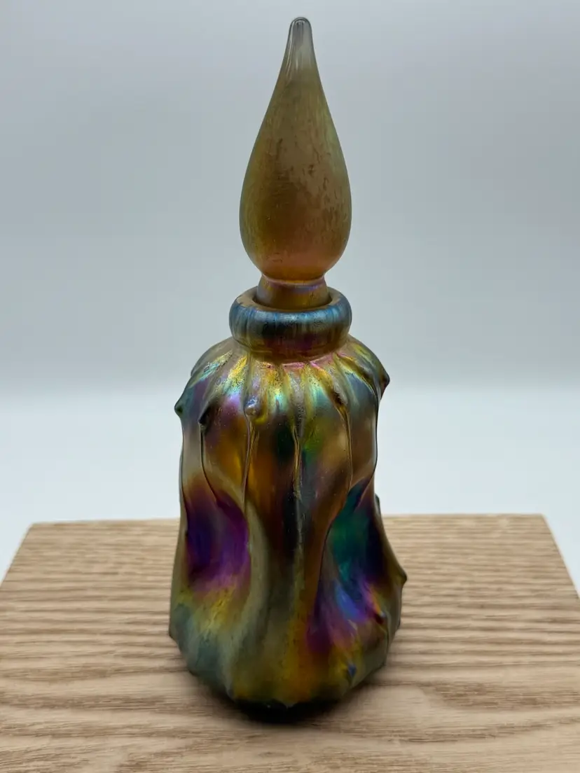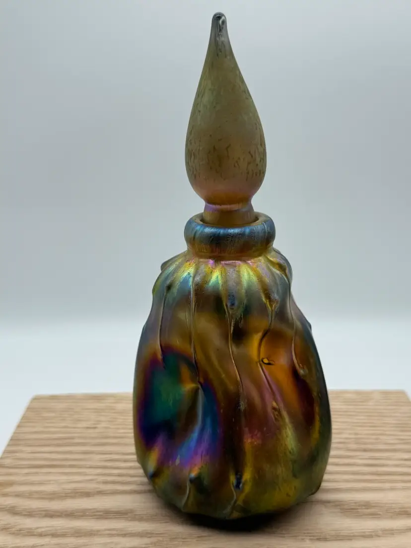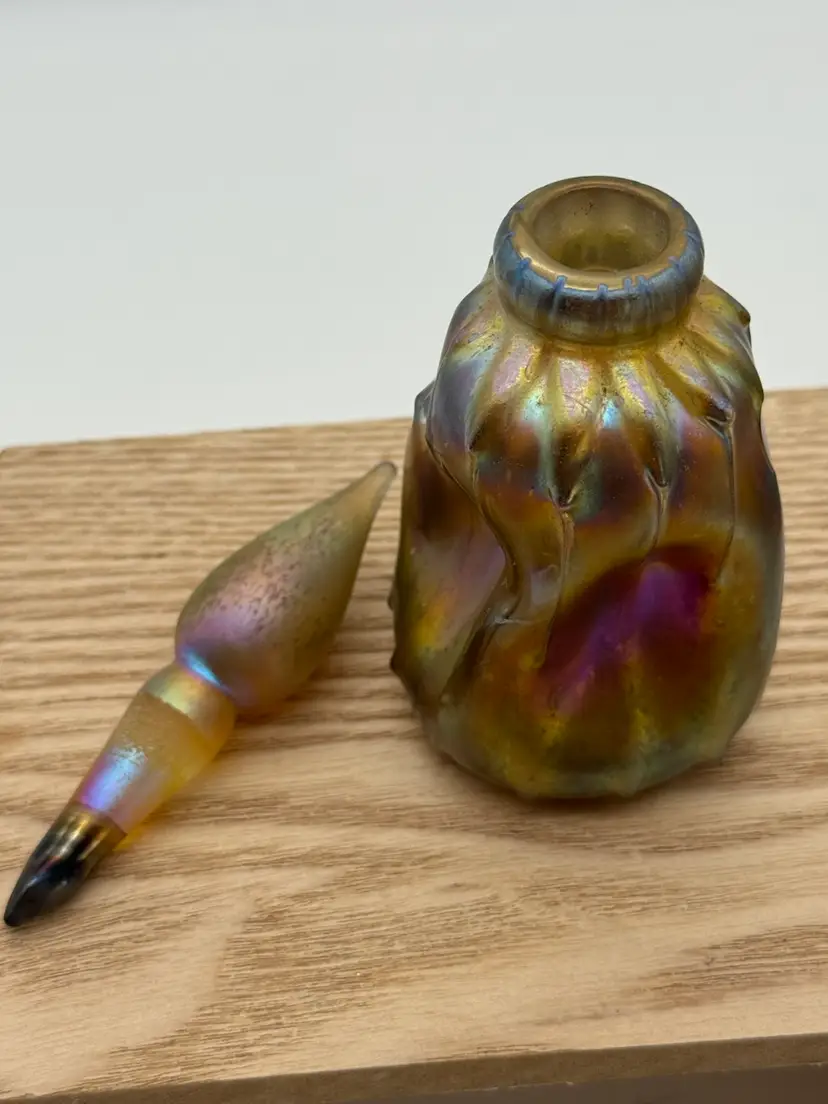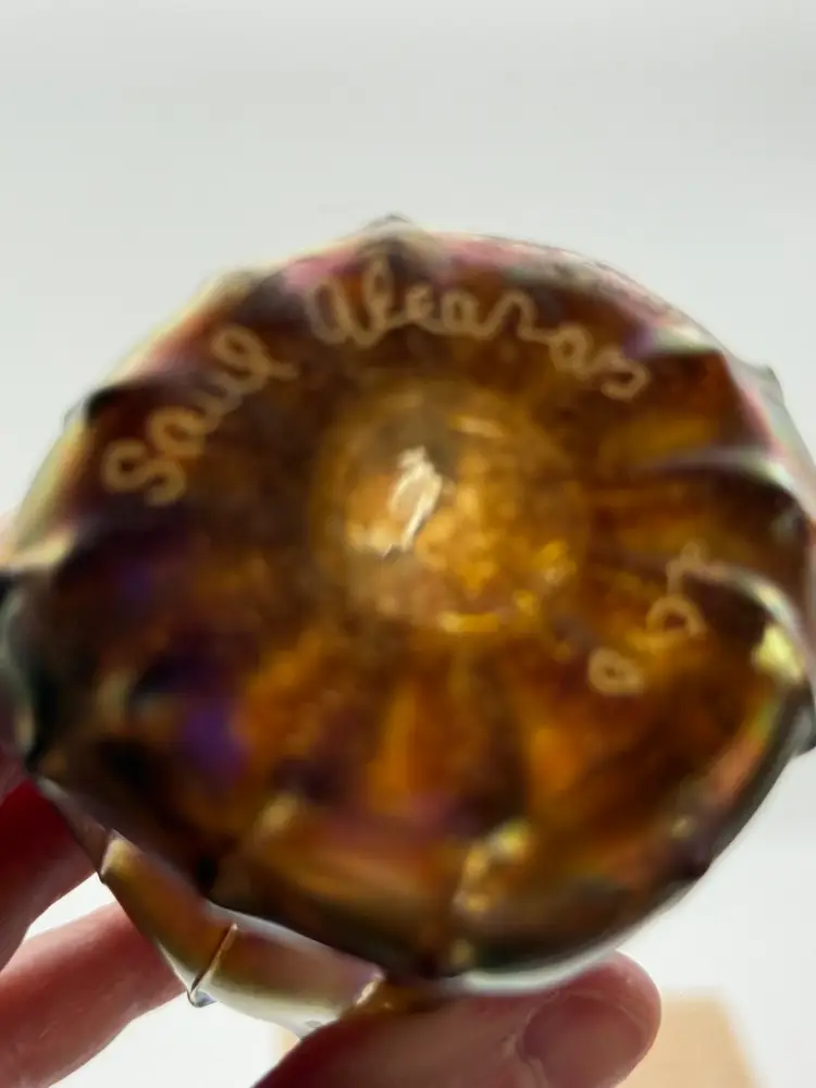 Measures just under 6” tall, 2.5” wide Has a manufacturers defect hole on side see photos. Would not be able to hold liquid higher than that point in the bottle. Otherwise, great condition. Signed Saul Alcaraz 2010