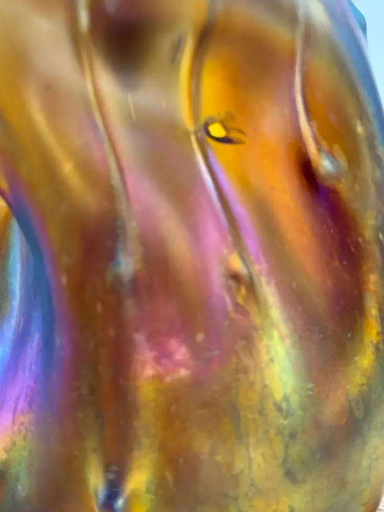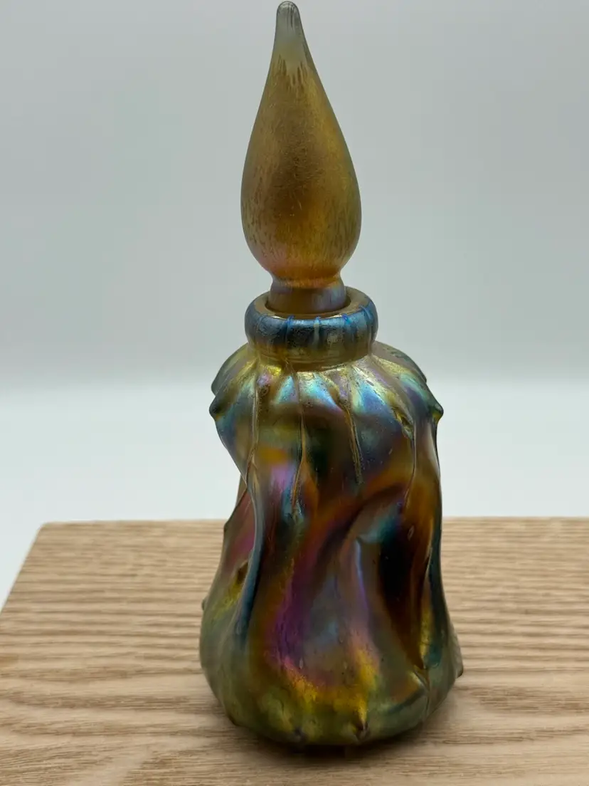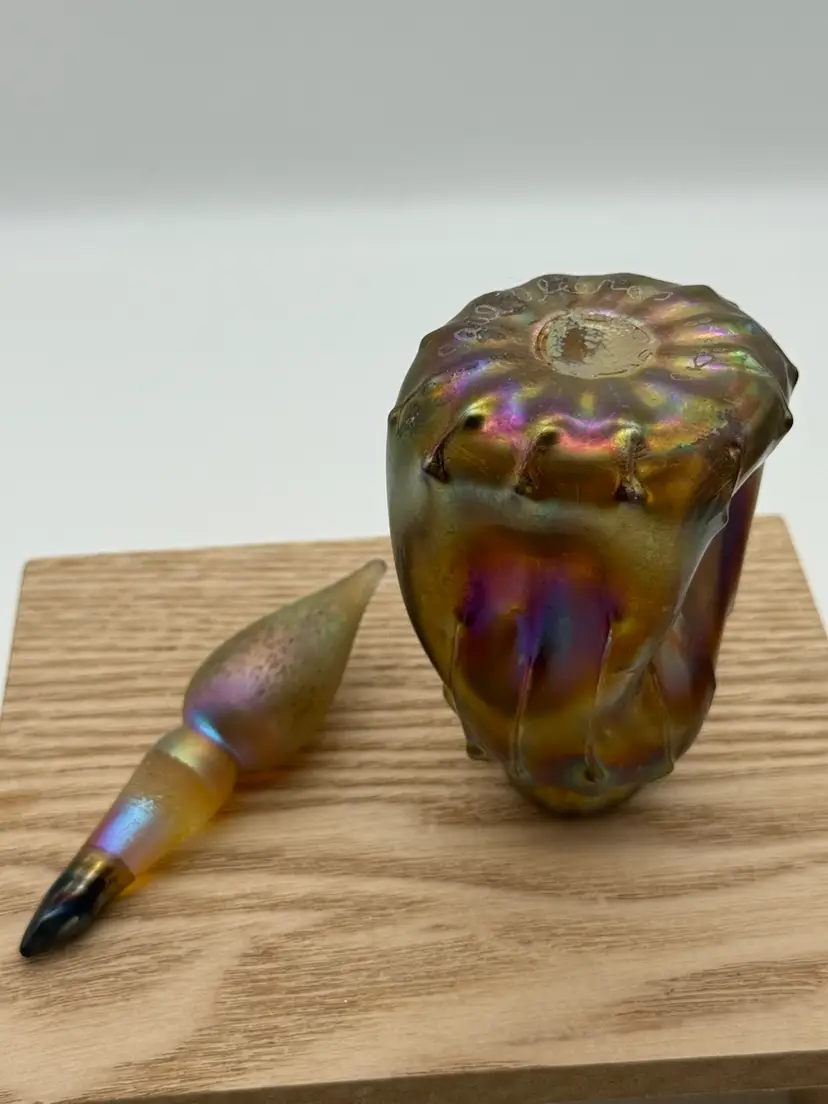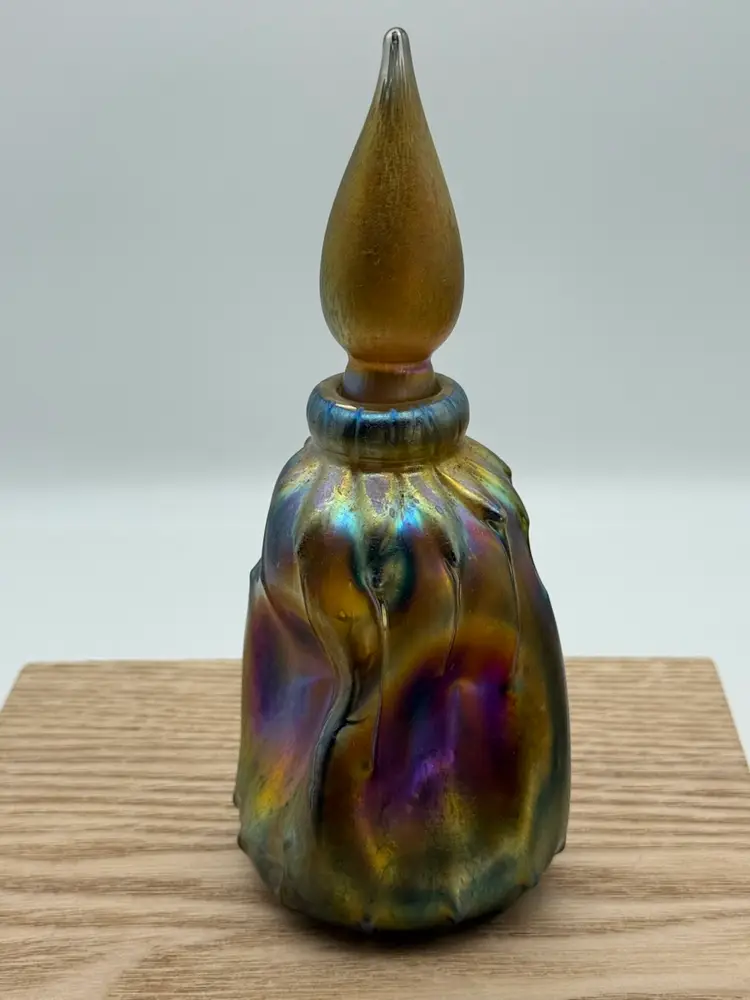 Measures just under 6” tall, 2.5” wide Has a manufacturers defect hole on side see photos. Would not be able to hold liquid higher than that point in the bottle. Otherwise, great condition. Signed Saul Alcaraz 2010