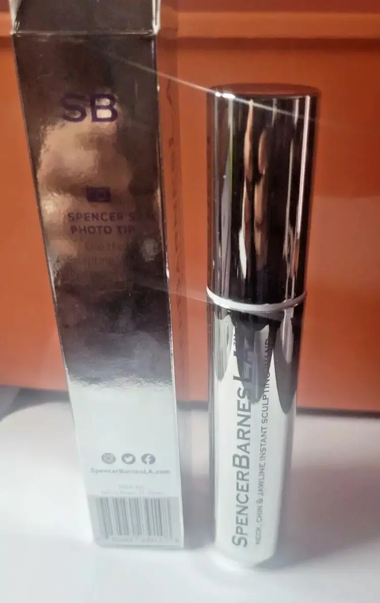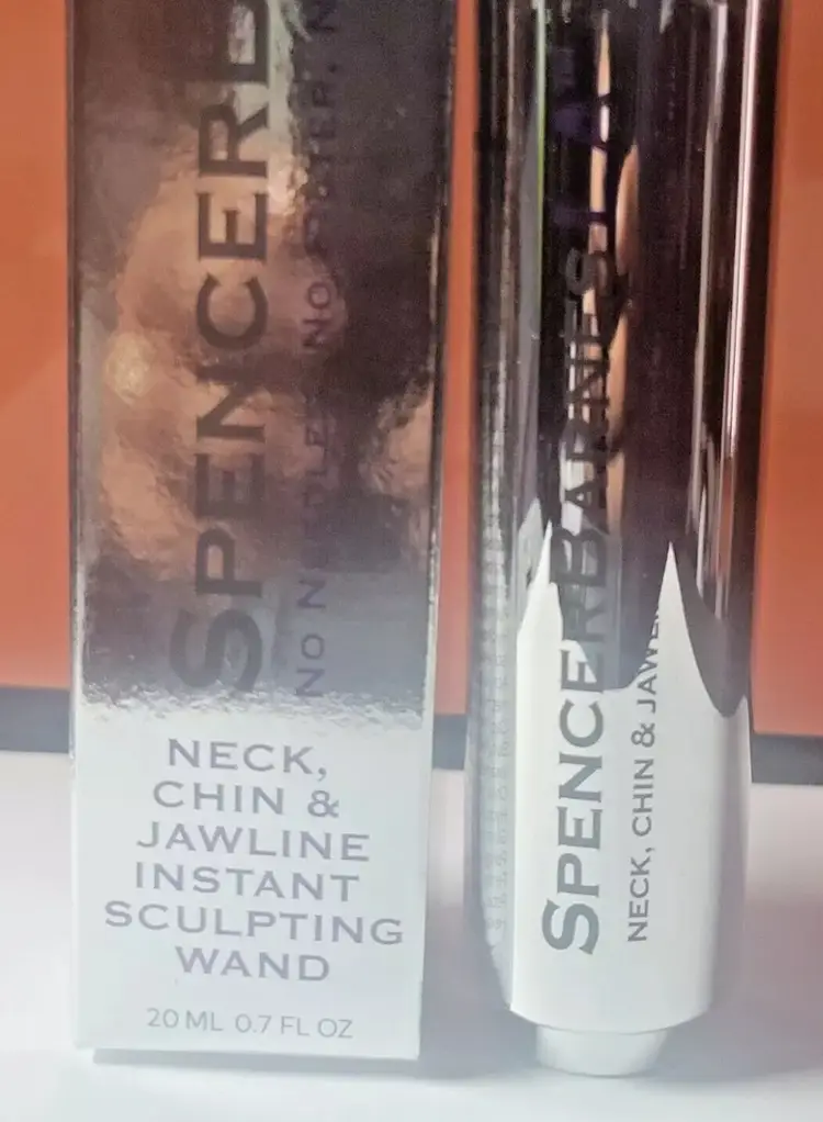 Spencer Barnes LA Neck, Chin & Jawline Instant Sculpting Wand. It is a serum that comes in a 20 ml (0.7 fl oz) container. "No needles, no filter, no surgeon, no kidding!". The benefits of the Spencer Barnes LA *Sculpting Wand include: *Smooths and tightens skin. *Reduces lines and wrinkles. *Boosts collagen production. *Brightens and evens out skin tone. *Reverses sun damage. *Firms and lifts sagging skin. *Moisturizes skin. *Reduces puffiness and inflammation. *May help with lymphatic drainage and relieving jaw tension.