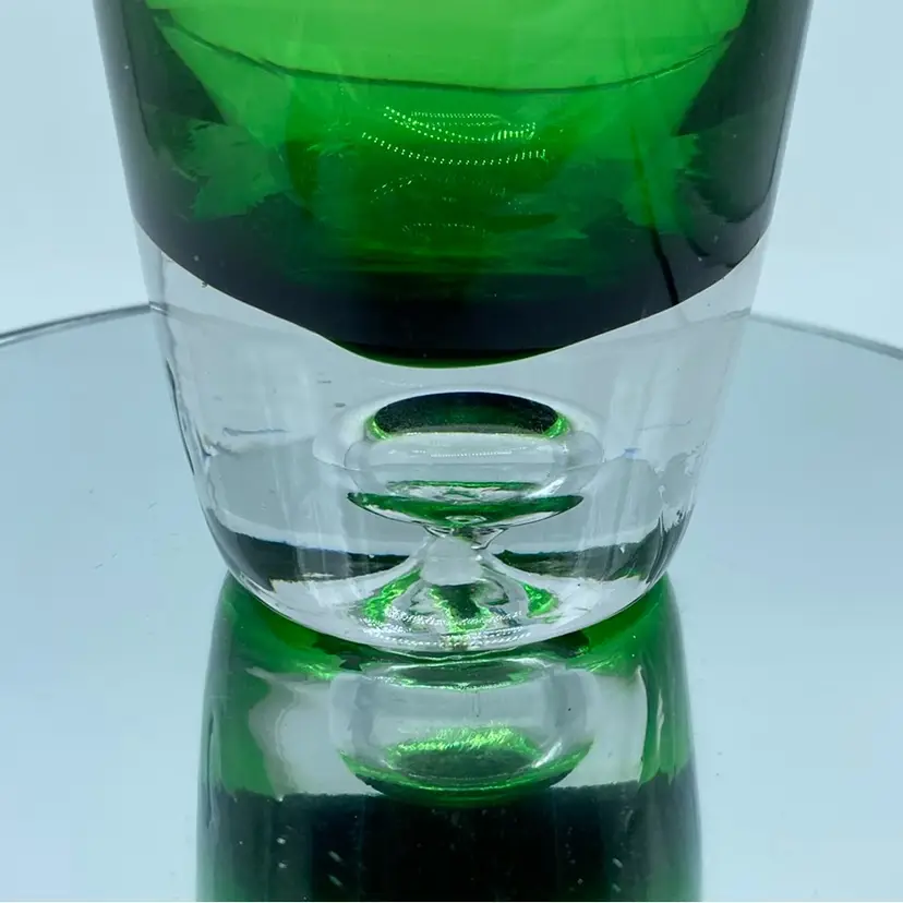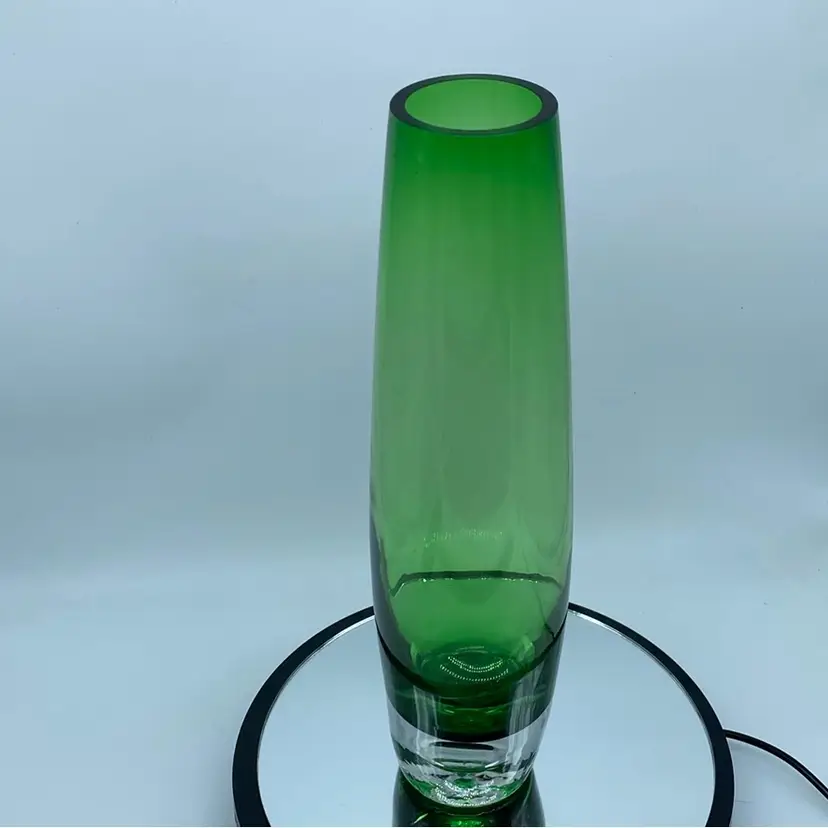 11.5 x 3.5 inch No chips or crack Tiny bruise or manufacturing flaw mostly unnoticeable in clear base Scandinavian glass design emerged in the early to mid-20th century, characterized by its simplicity, functionality, and elegance. Designers drew inspiration from the natural landscapes of the Nordic region, incorporating organic forms and subtle colors into their creations.