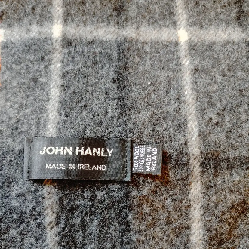 Scarf: Brand- John Hanly. Made in Ireland. Material- 70% wool, 30% cashmere. Black & grey plaid. No callouts.