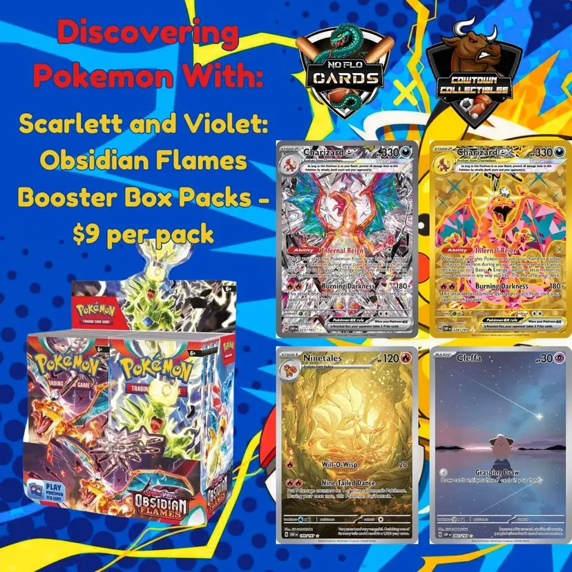 Grab your Scarlett and Violet: Obsidian Flames Booster Box Packs for just $9 each! Dive into the world of Pokemon with NoFlo Cards and Cowtown Collectibles. Perfect for collectors and enthusiasts looking to expand their collection. Happy hunting!