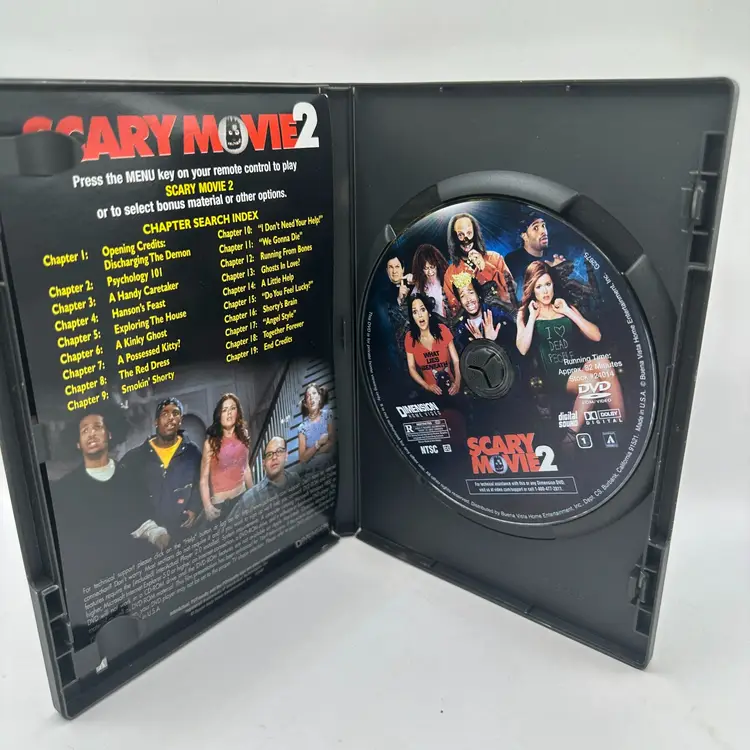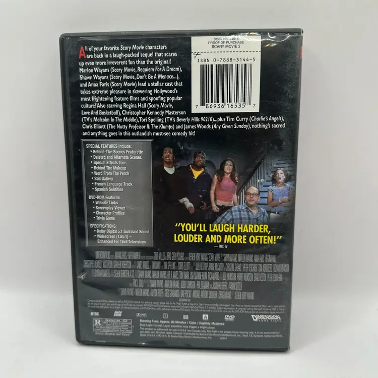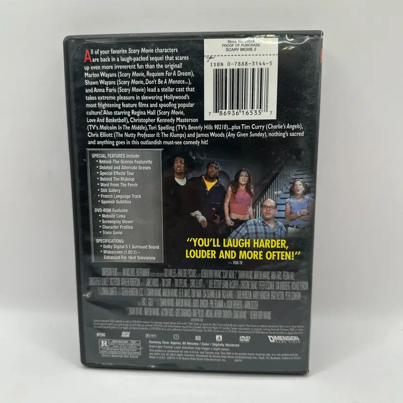 All your favorite SCARY MOVIE characters are back in a laugh-packed sequel that scares up even more irreverent fun than the original! Marlon Wayans (SCARY MOVIE REQUIEM FOR A DREAM) SHAWN WAYANS (SCARY MOVIE DON T BE A MENACE..) and Anna Faris (SCARY MOVIE) lead a stellar cast that takes extreme pleasure in skewering Hollywood s most frightening feature films and spoofing popular culture! Also starring Regina Hall (SCARY MOVIE LOVE AND BASKETBALL) Christopher Kennedy Masterson (TV S MALCOLM IN THE MIDDLE) Tori Speling (TV s BEVERLY HILLS 90210).. plus Tim Curry (CHARLIE S ANGELS) Chris Elliott (THE NUTTY PROFESSOR II: THE KLUMPS) and James Woods (ANY GIVEN SUNDAY) nothing s sacred and anything goes in this outlandish must-see comedy hit! Size: Unisex OS