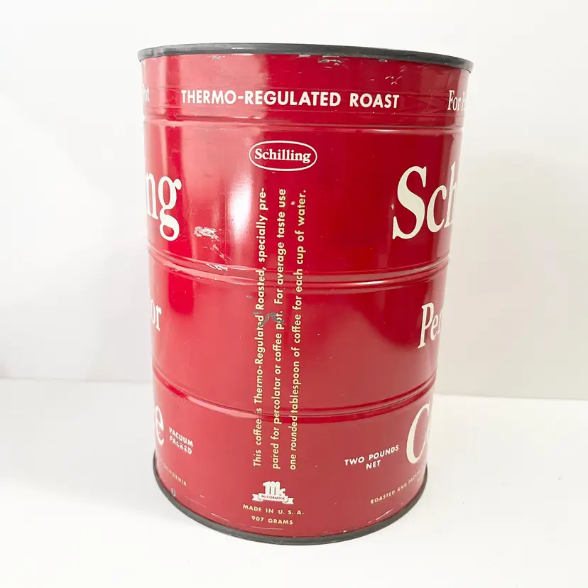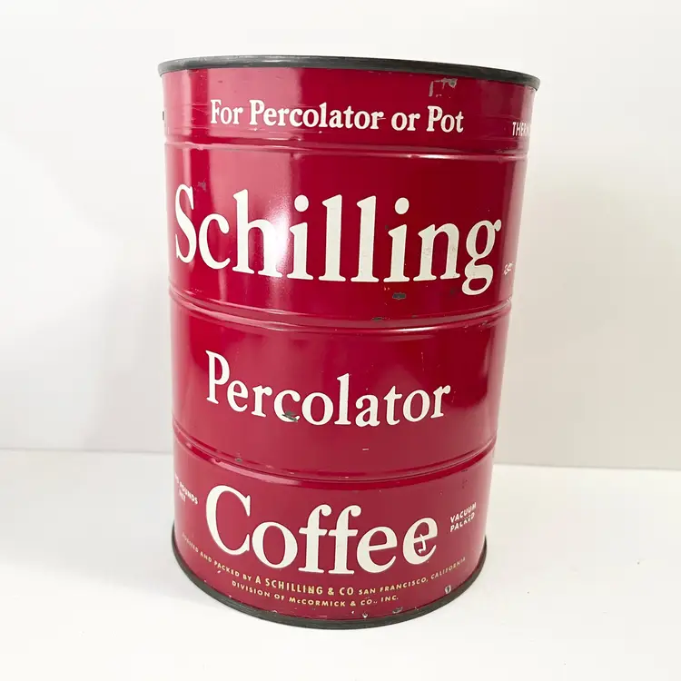 Schilling Percolator Coffee Two Pound Can Unopened With Key Kitchen Decor Display Vacuum Packed Thermo-Regulated Roast For average taste use one rounded tablespoon of coffee for each cup of water Roasted and Packed by Schilling & Co San Francisco, California Division of McCormick & Co, Inc. Condition: Paint chips, scrapes, scratches. A ding in the top lid perimeter area. The top and bottom of the can is tarnished, discolored. Tape and label residue on the top and bottom. Measures 7 inches x 5 inches Packaged in a plastic sleeve inside a rigid box Visit my store to see more vintage ephemera, advertising, novelties, gifts, estate sale and yard sale finds https://district.net/u/finderspickerspaper SKU Box Cabinet