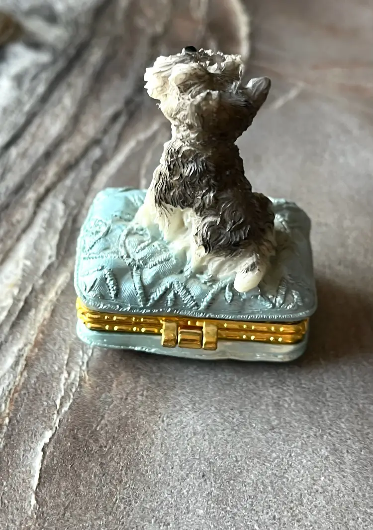 This darling little Schnauzer dog or puppy trinket box is approximately 2 1/4 inches tall, 1 3/4 inches wide and 1 1/2 inches deep. Preowned. Excellent condition.
