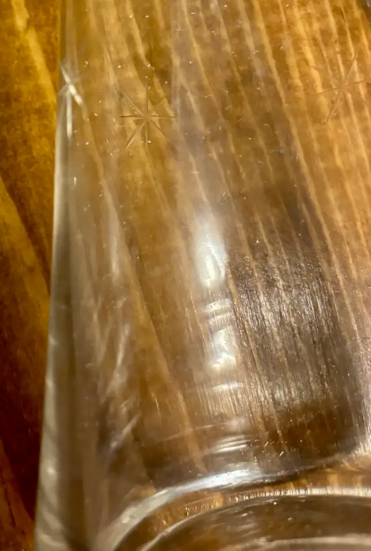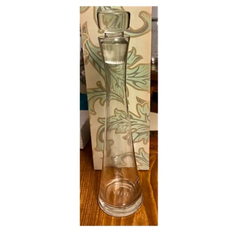 Approx. 10.5” (12” w/stopper) 3” at widest part bottom Wine decanter with stopper likely made by Schott Zwiesel for Zafra cosmetics company of California! In mint condition No marks or breaks and still in original foam secured box It has star bursts etched out of the glass which is more than likely crystal