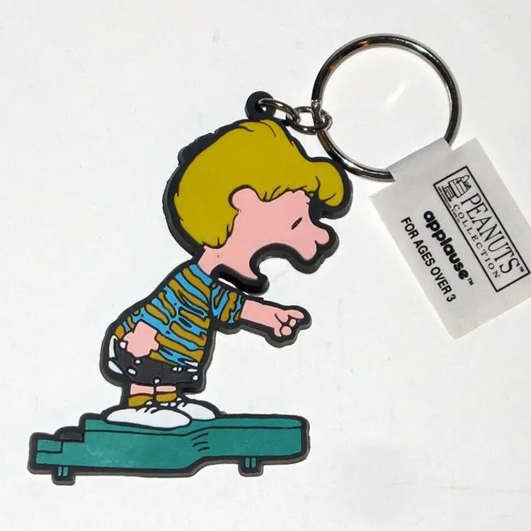 Carry a piece of the Peanuts gang with you wherever you go with this Schroeder on his Piano keychain. Featuring Schroeder in his classic striped shirt, this keychain is perfect for any Peanuts fan. Appears unused and is made of a flexible, rubber-like material by Applause.