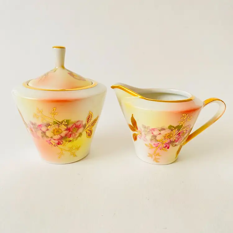 No chips, cracks or crazing. Creamer measures 2.5” tall. Sugar is 3.5” tall with lid. Small patch of gold trim missing on the rim of the creamer.