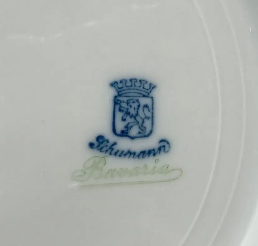 According to the backstamp on this plate, it is from the 1930-1940's. It was manufactured in Arzberg, Bavaria, Germany by the Porzellanfabrik Carl Schumann Porcelain Company. It has 10 sides that are pierced with gold trim.