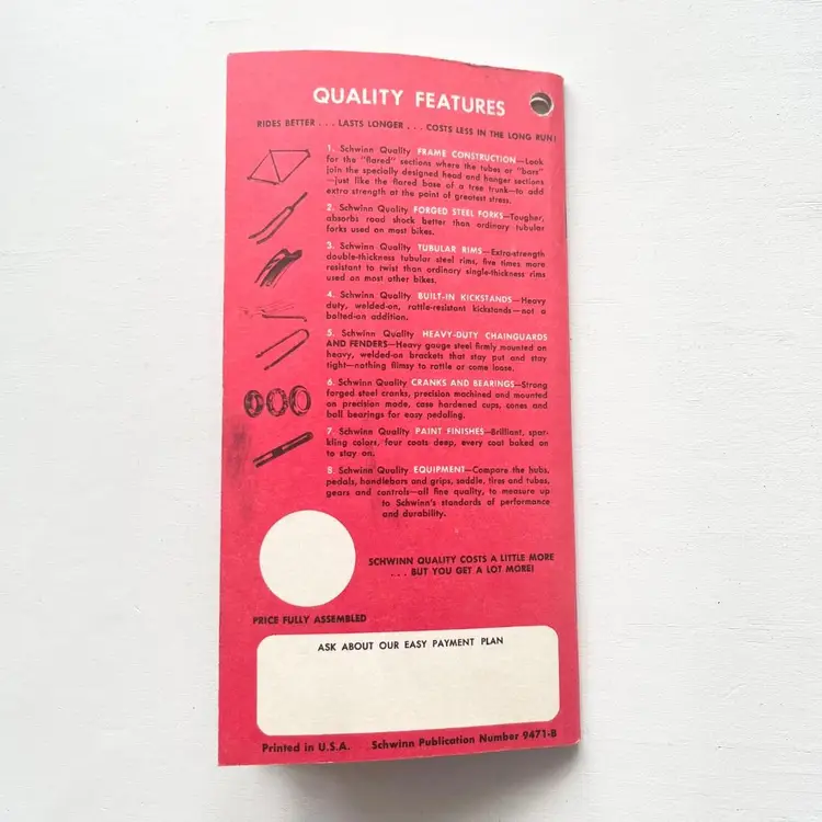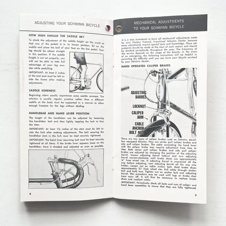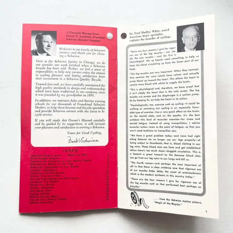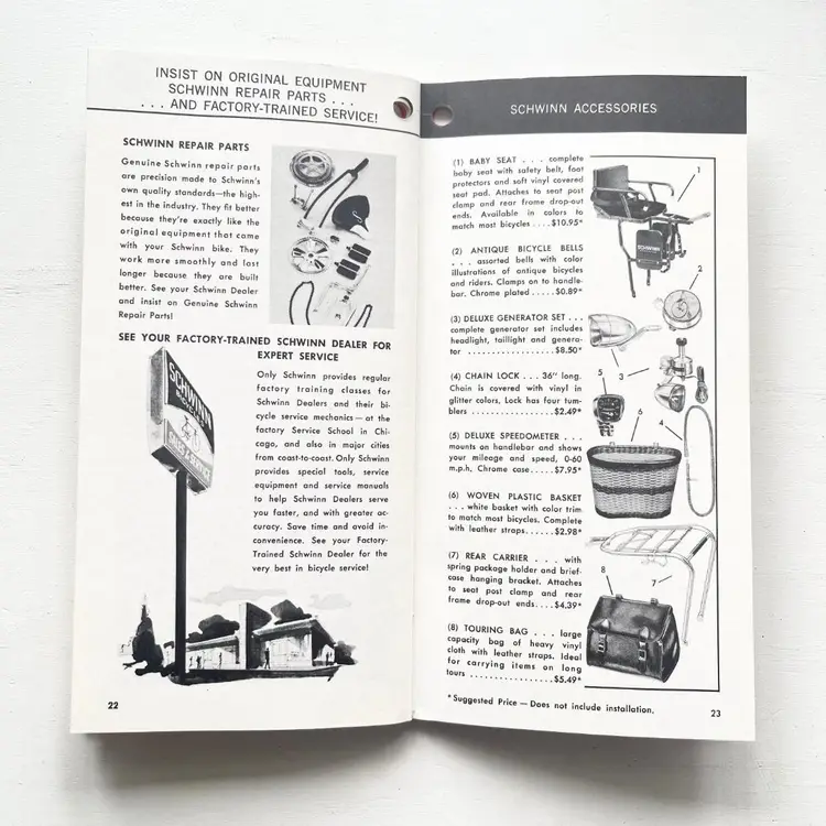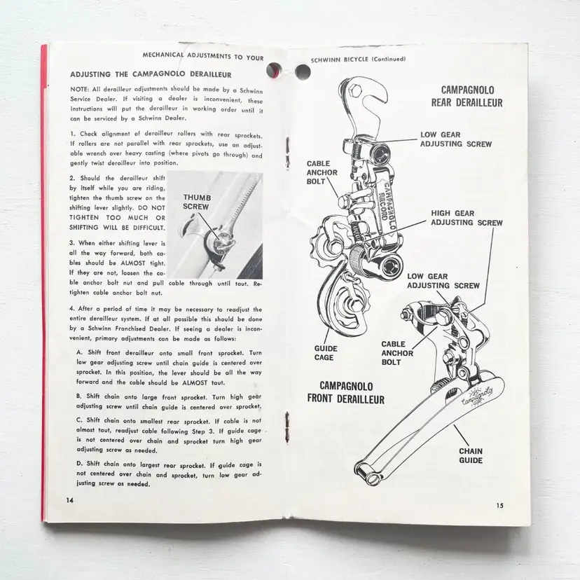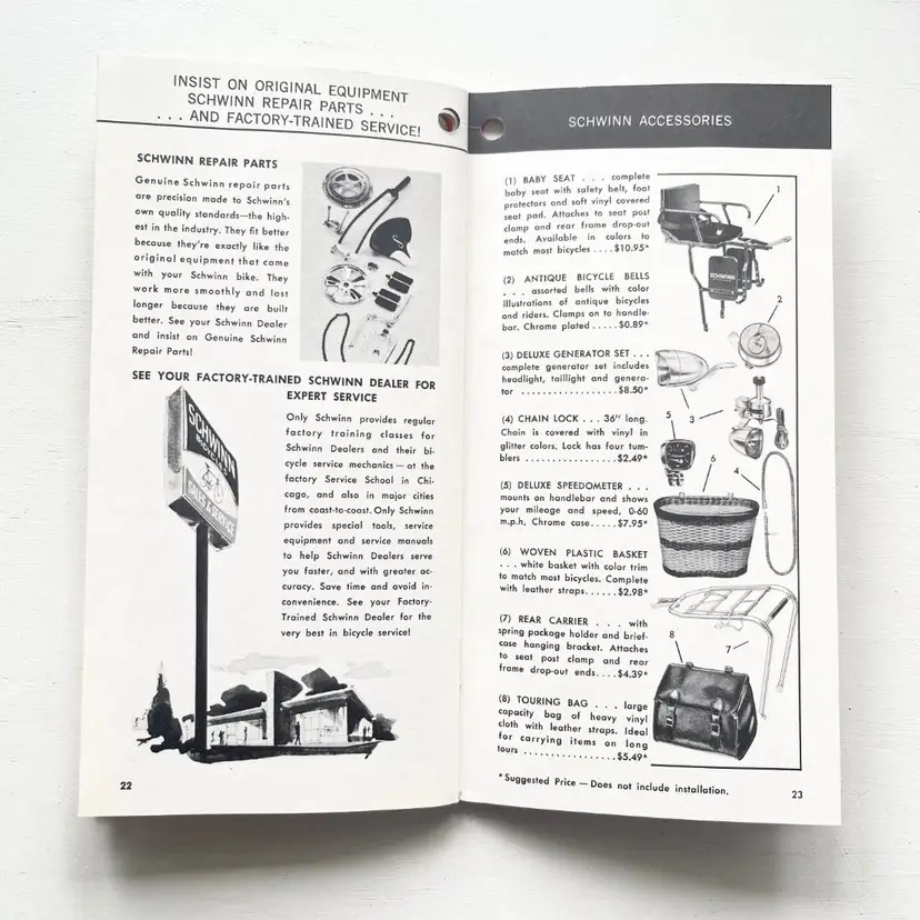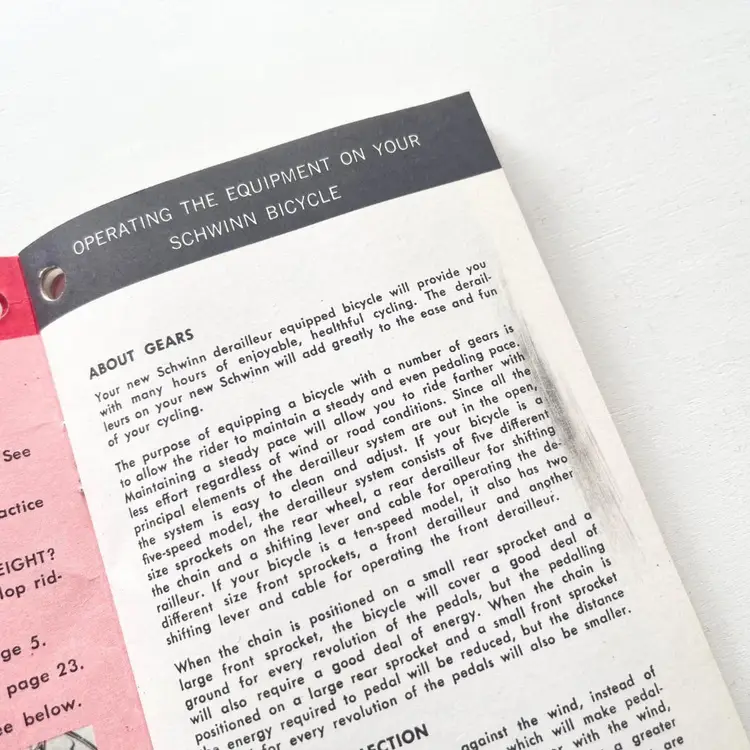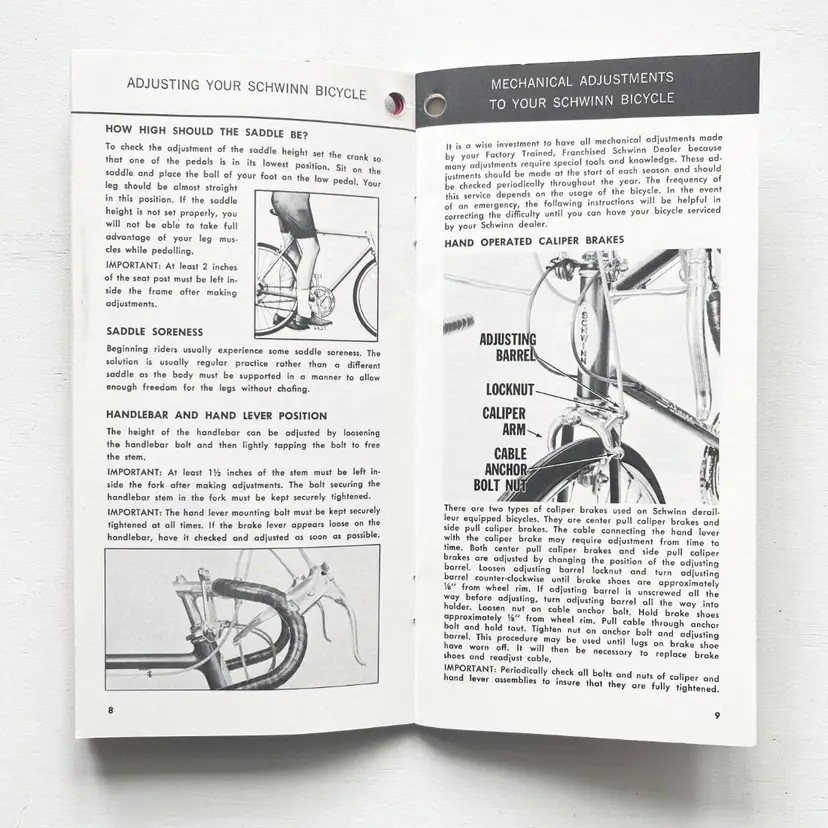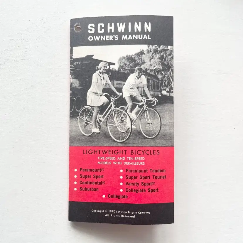 Schwinn Lightweight Bicycles Owners Manual Vintage 1970s 5 10 Speed Derailleurs Paramount, Super Sport, Continental, Suburban, Paramount Tandem, Super Sport Tourist, Varsity Sport, Collegiate Sport and Collegiate A Personal Message from Frank V. Schwinn, President Schwinn Bicycle Company Dr. Paul Dudley White Heart Specialist Explains the Benefits of Cycling Important Things to Know Before You Ride Serial Number Location Operating the Equipment of Your Schwinn Bicycle Adjusting the Bicycle to Your Size Mechanical Adjustments to Your Bicycle Derailleur Adjustments Lubrication and Maintenance Schwinn Tires and Tubes Tire and Tube Damage and Their Causes Emergency Tire Repairs Protect Your Bicycle Schwinn Accessories Safe RIding Rules Cycling Activities Schwinn Quality Report Free 30 Day Check Up Coupon Schwinn Guarantee 26-Page Booklet Condition: Wear around the edges, on the corners, around the hanger hole area. The pages are clean. Measures 7-1/2 inches x 4 inches Packaged in a plastic sleeve inside a rigid envelope Visit my store to see more vintage ephemera, advertising, novelties, gifts, estate sale and yard sale finds https://district.net/u/finderspickerspaper SKU B31