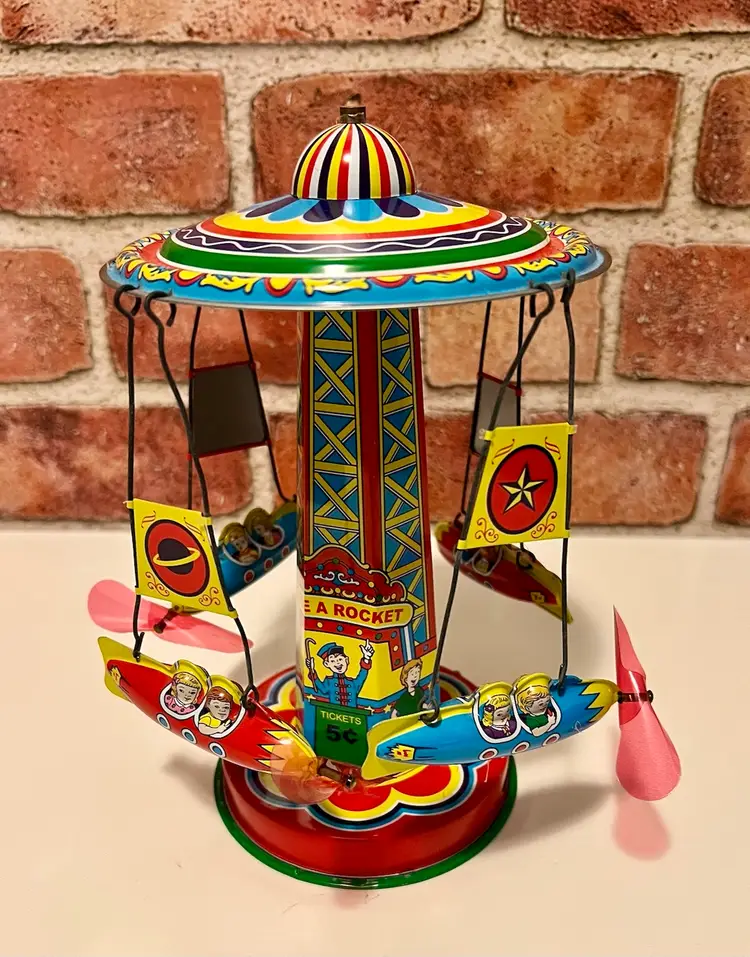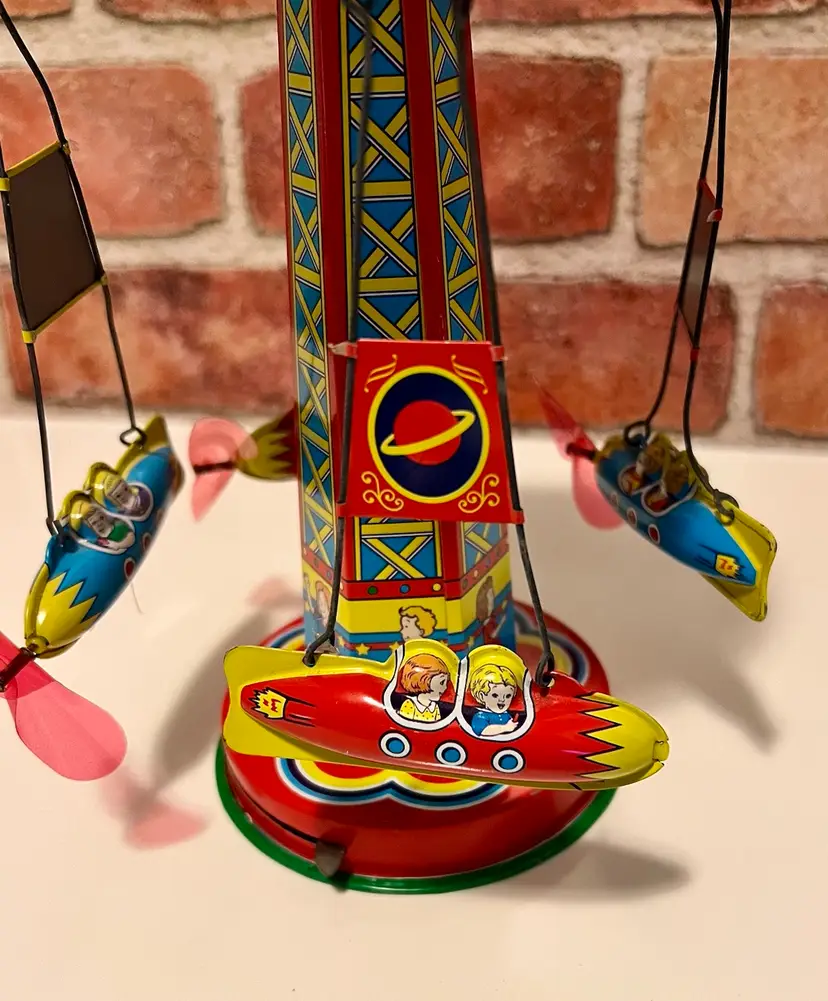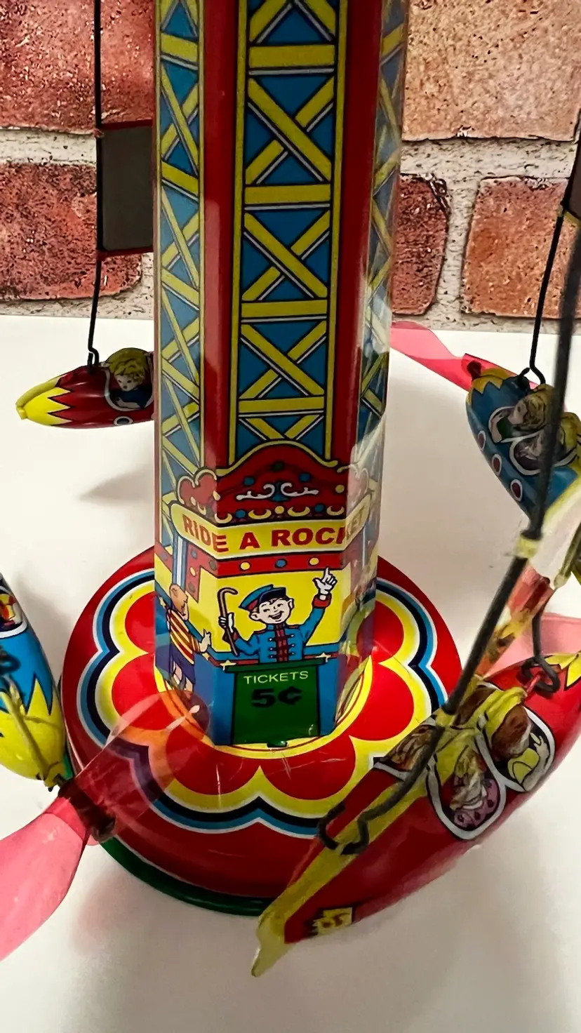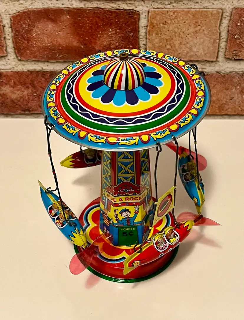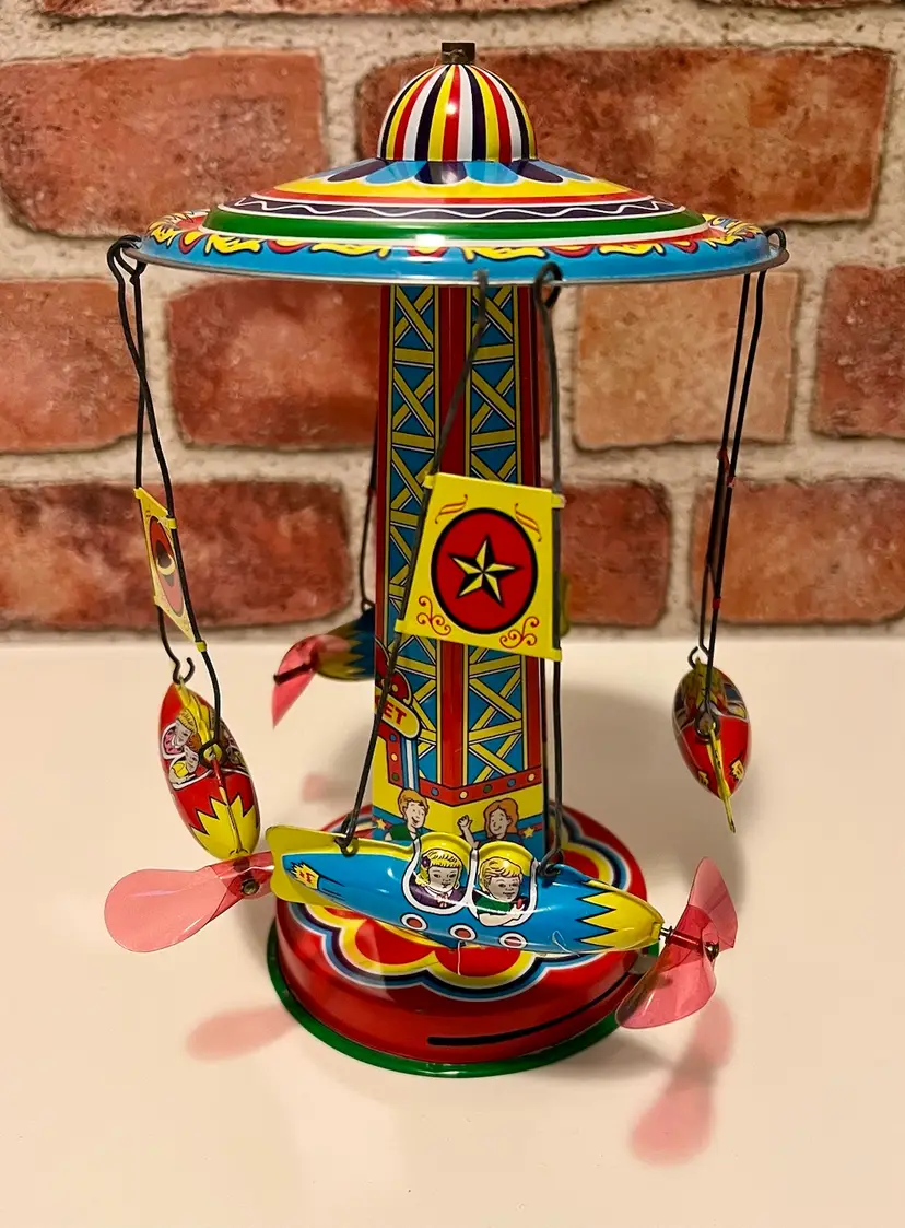 Super fun and cool metal carousel with wind up and release mechanism. See the video for live demonstration of how the planes revolve around this carousel! Vintage condition with 1 propeller missing, but it works well and the engineering is old school and cool. Fun to share with children and have as a keepsake. This is not a toy.