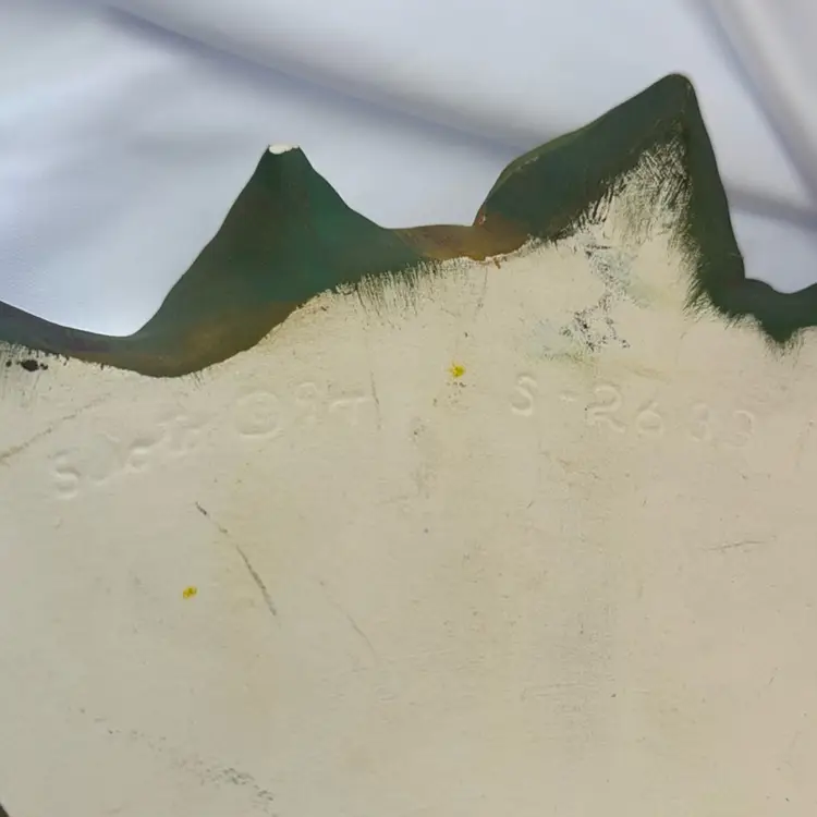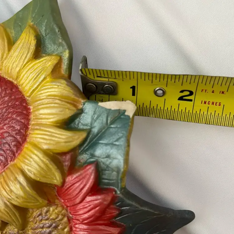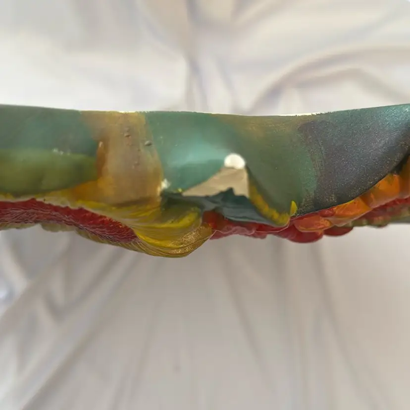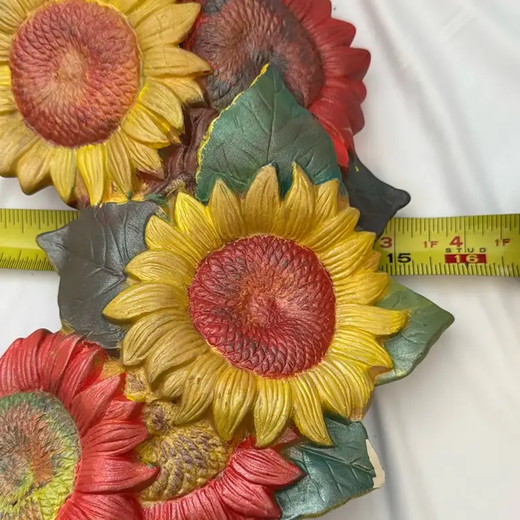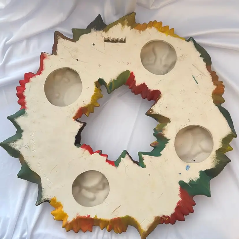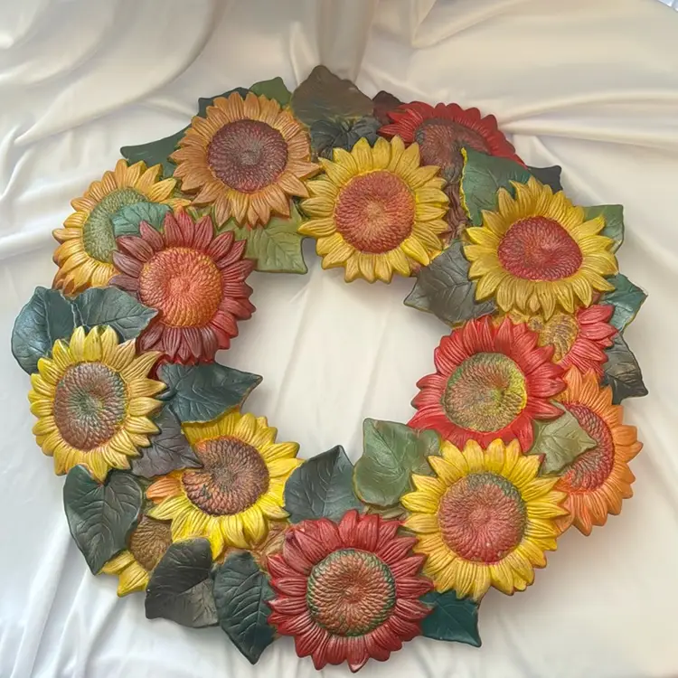 Beautiful hand painted ceramic wreath. Tones of orange, gold , yellow and green. Measures about 16” across. Has a few tiny flea bite and some spots where the painter missed. There is one large chip as noted in two photos.