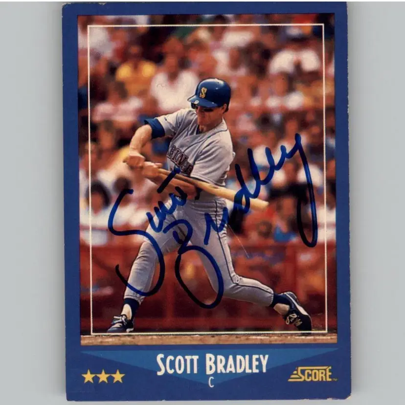 Authentic 1988 Score baseball card featuring Scott Bradley, catcher for the Seattle Mariners, adorned with his signature. A treasured find for Mariners fans and autograph card collectors. Your purchase aids Signatures For Soldiers in their mission to support homeless and disabled veterans.
