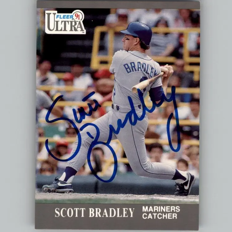 Authentic 1991 Fleer Ultra baseball card featuring Scott Bradley of the Seattle Mariners, adorned with his signature. A treasured item for Mariners fans and autograph card collectors. Your purchase aids Signatures For Soldiers in their mission to support homeless and disabled veterans.