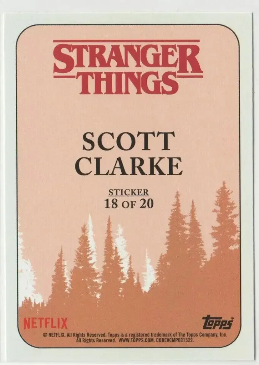 Scott Clarke #18 Character Sticker insert chase 2018 Topps Netflix Stranger Things Season One streaming series trading card Randy Havens