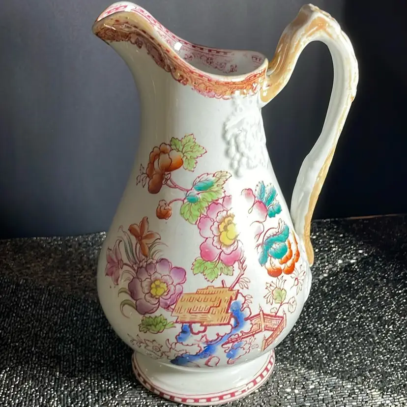 This is a mid-19th-century Scottish Clyde Pottery wash jug with an Oriental or Athenian pattern. It is a large pitcher, with a floral transferware design featuring a mountain landscape and a small bird drinking water. The jug likely dates to around the 1850s and was possibly made by Clyde Pottery for their Athenian range. Clyde Pottery jugs were a popular item for the company, which operated from 1862-1900. The pattern is a form of chinoiserie decoration, which was popular on pottery during this period.