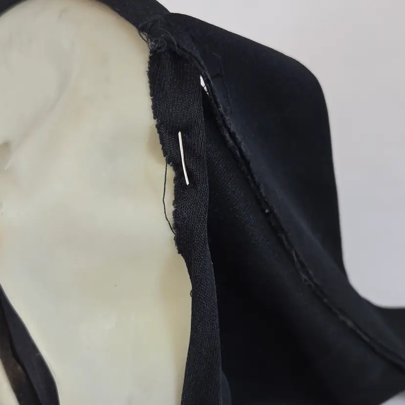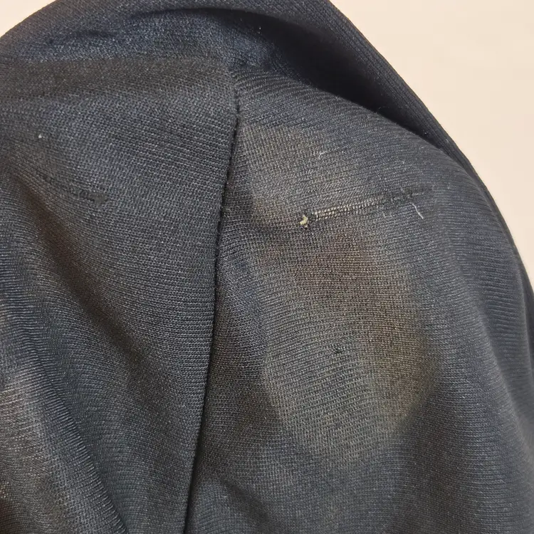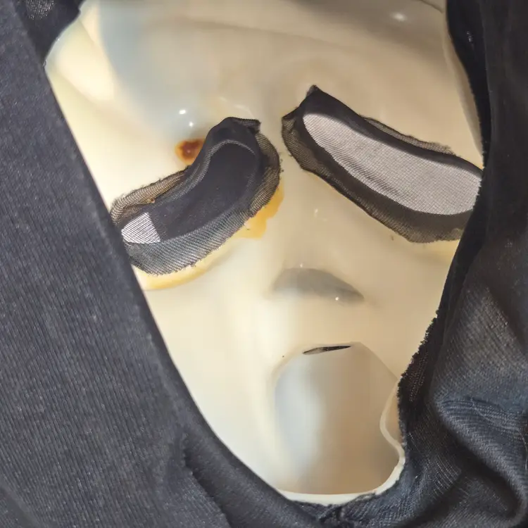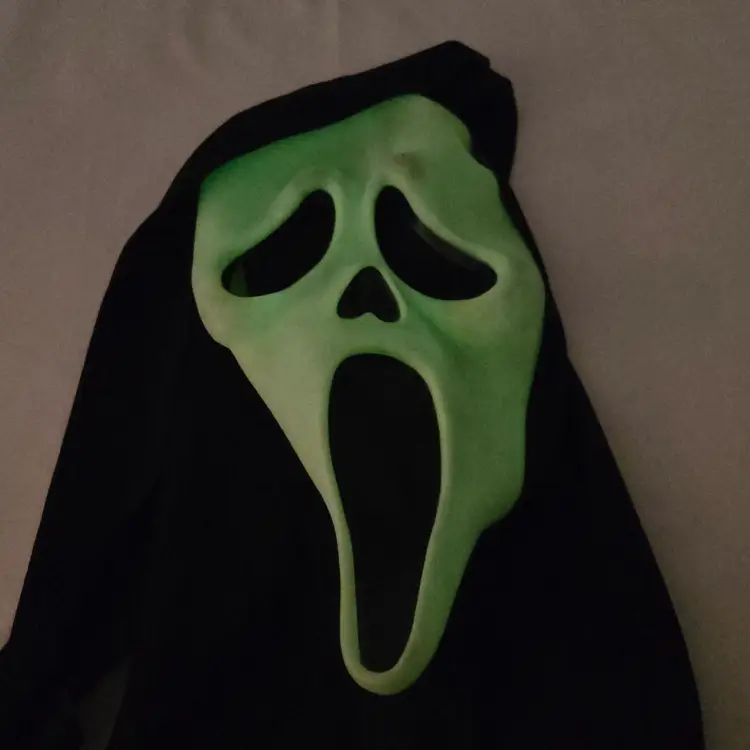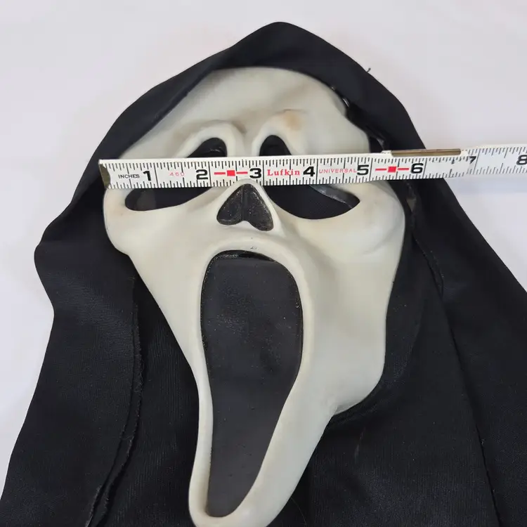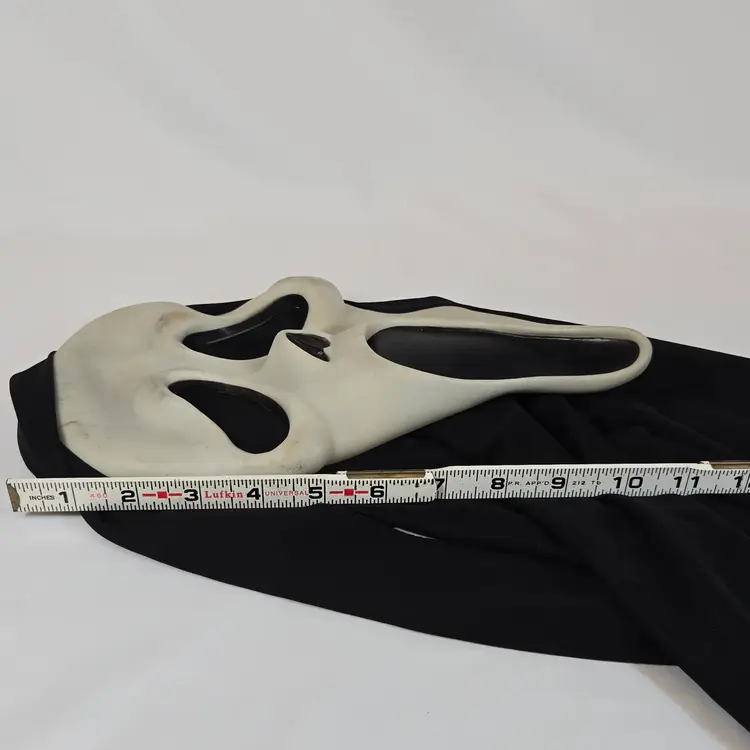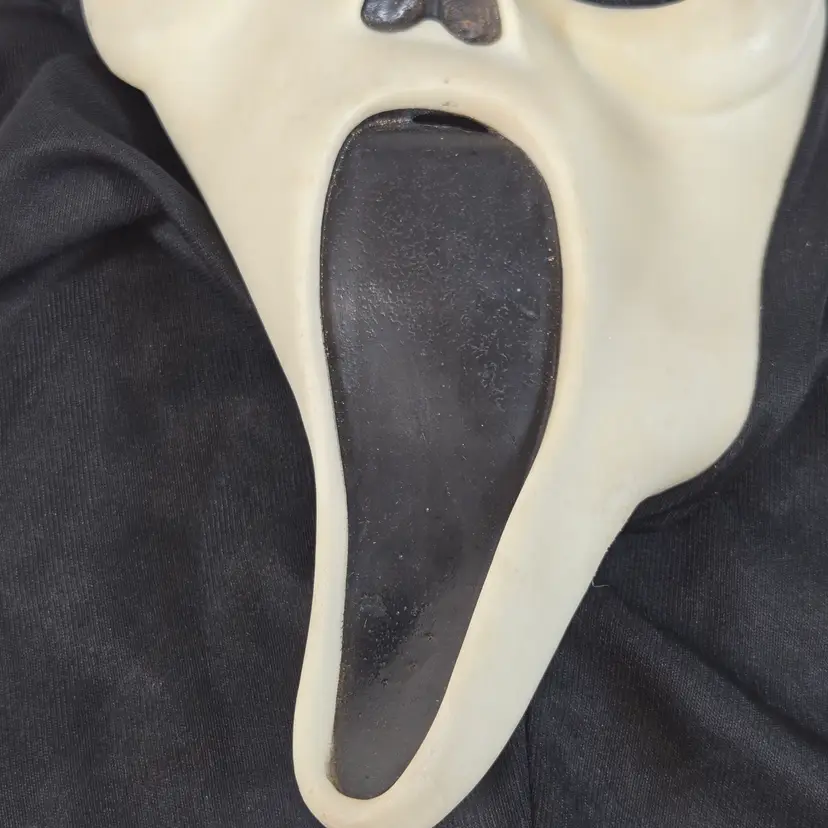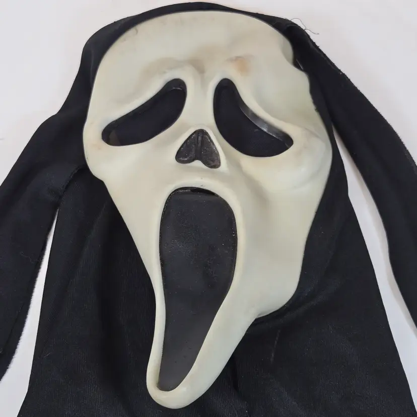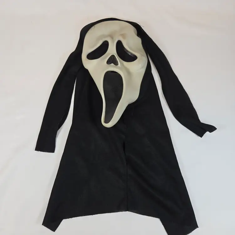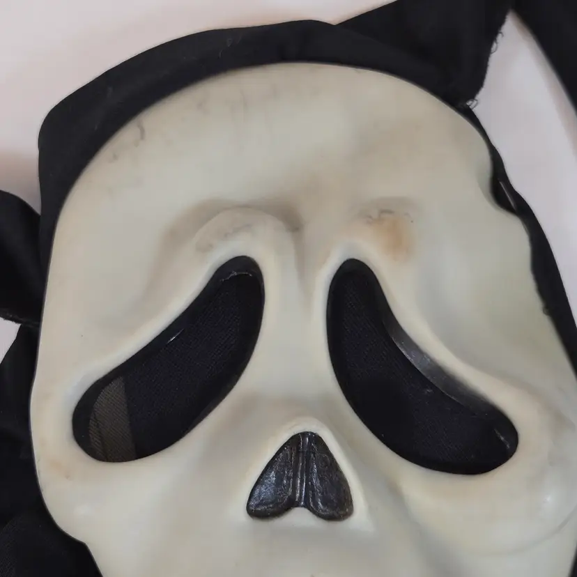 Classic Ghostface mask with attached black shroud, marked Easter Unlimited Inc China. Mask glows in the dark. Heavy wear from age and use – fabric has some fraying and is safety-pinned at top right side. Could still be sewn back. The glue inside (eyes) has browned but is still holding fabric fine. Front of mask needs cleaned. To much of a classic to toss so maybe someone could give it more love than I can.