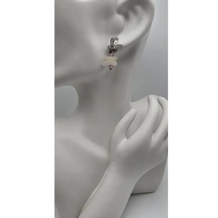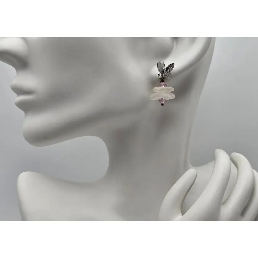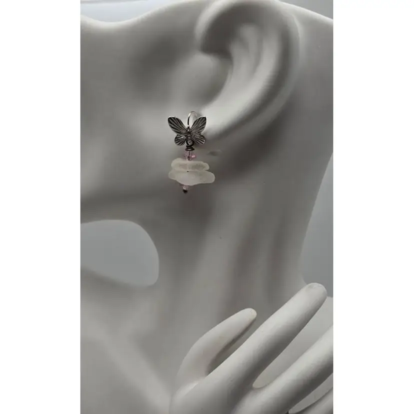 Real Maine sea glass hangs from beautiful butterfly ear hook earrings, accented with pale pink glass beads. Ear wires are silver plate on brass. Earring length is 1 1/4".