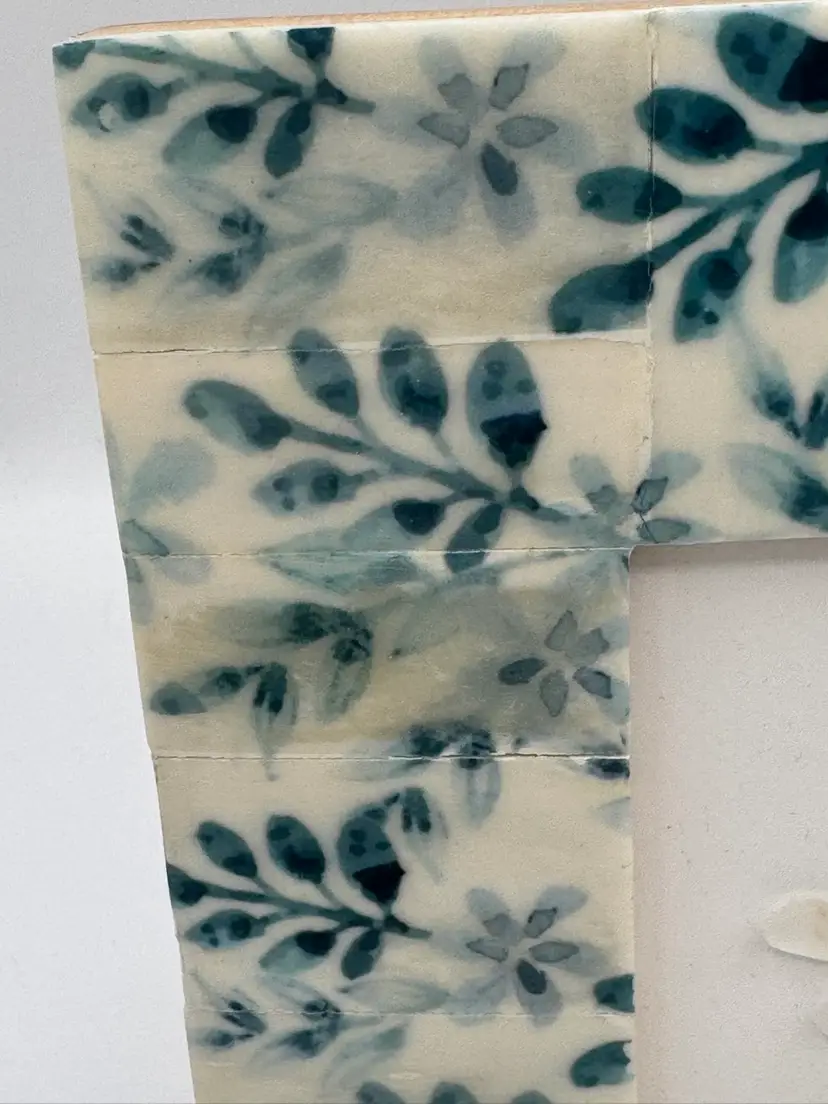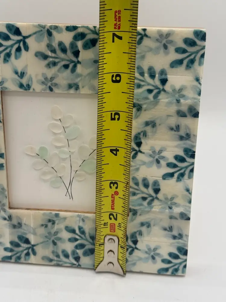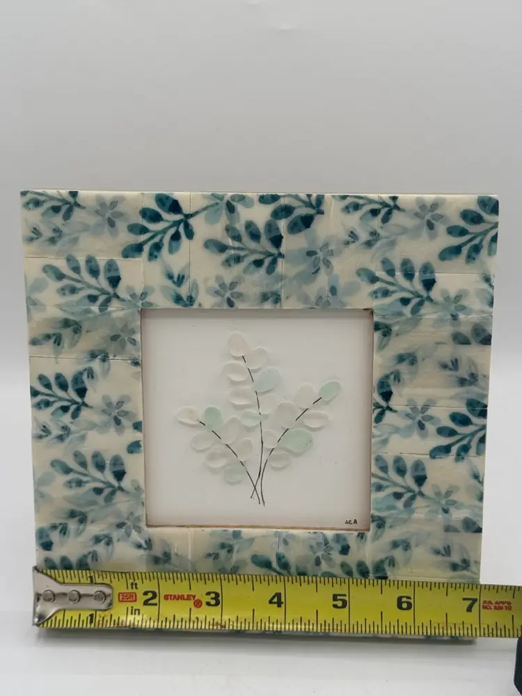 This is a 7”x7” handmade piece of sea glass artwork. The frame is made of pieced ceramics tile with a floral design. Singed by the artist.
