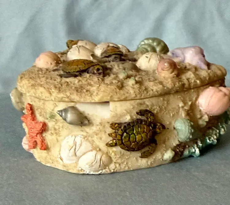 Adorable resin heart shaped trinket box with undersea motif, turtles, shells, starfish etc.