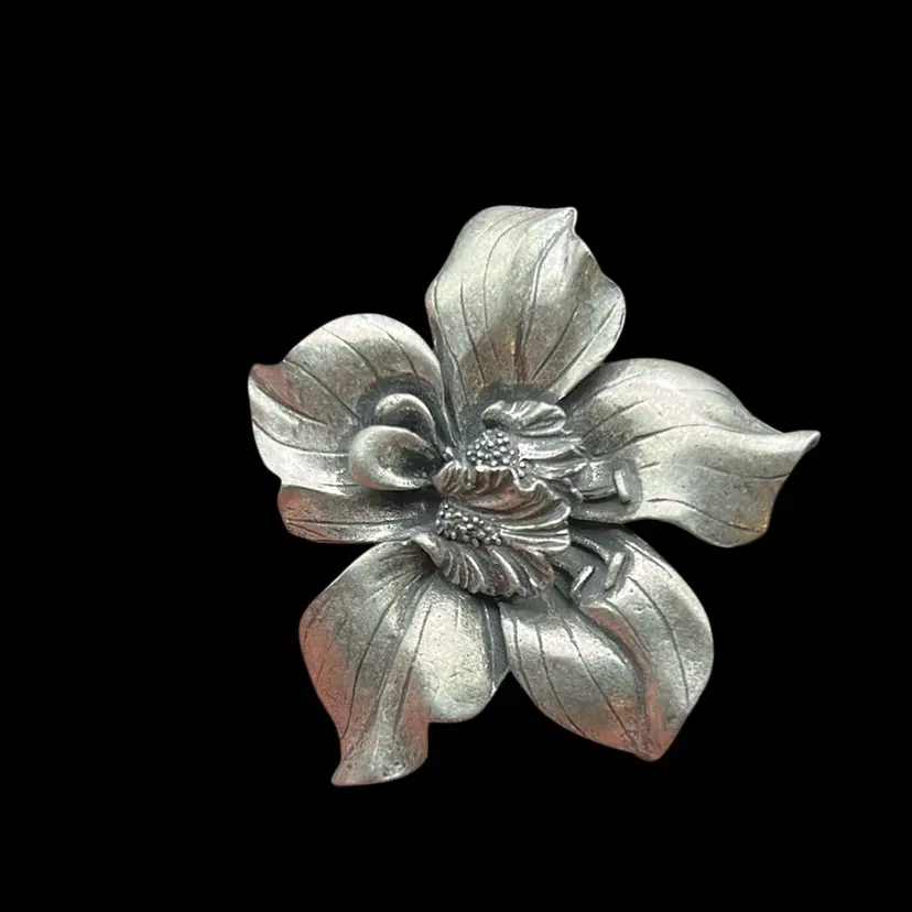 ๐น Maker: Seagull Pewter (Canada) ๐น Marked: ยฉ 2006 Seagull / JP 300 ๐น Style: Orchid flower brooch ๐น Finish: Antiqued silver-tone pewter ๐น Closure: Secure pin back ๐น Condition: Excellent vintage condition ๐น Size: 2โ