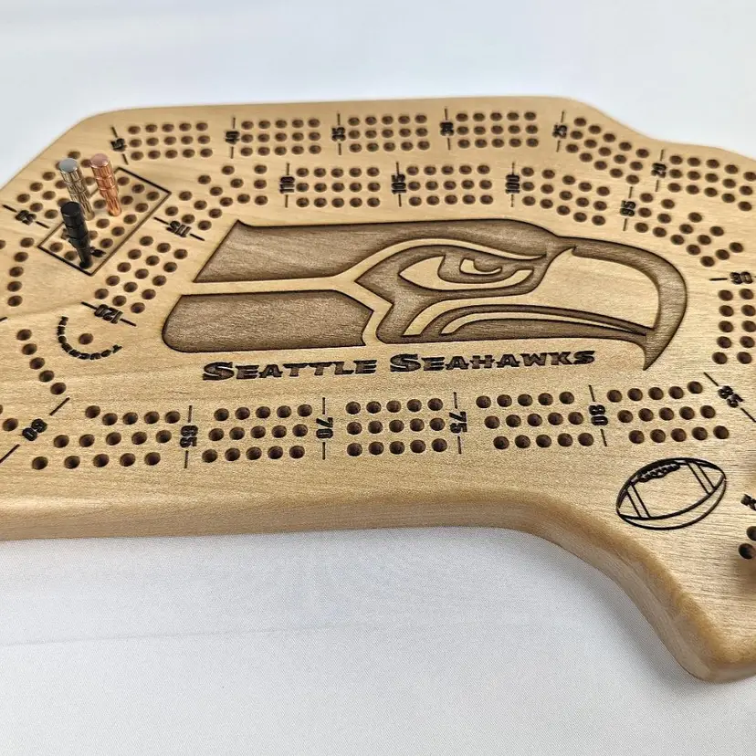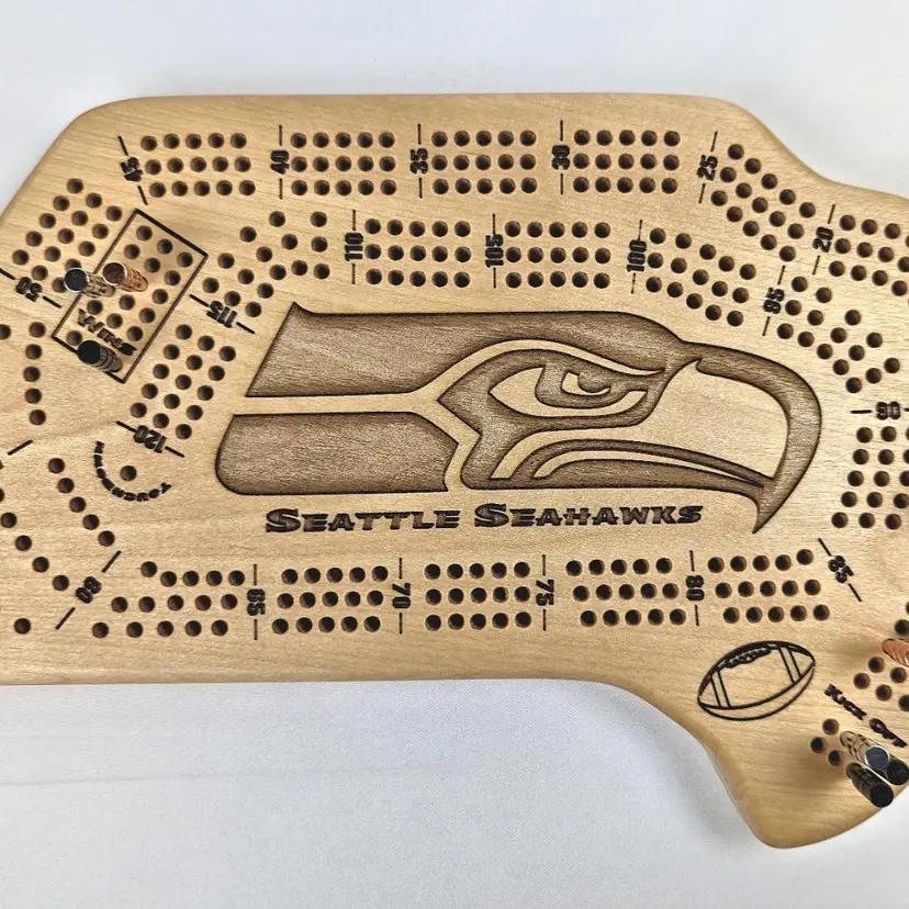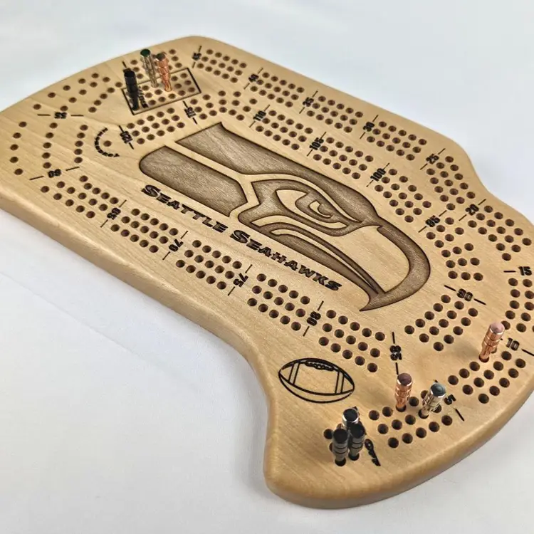 A solid maple cribbage board for up to three players, and comes with a set of metal pegs. This is a natural wood product so the color of and pattern of the wood will vary slightly from the images shown.