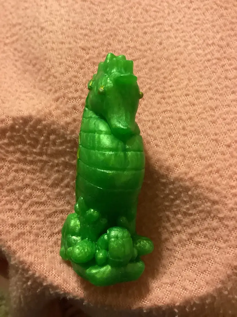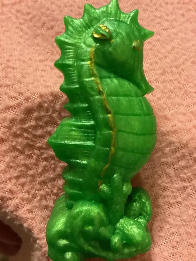 This cute little seahorse is made out of green resin. It is 3 inches tall and half inches and 1 inch deep. It has gold eyes and gold trimming on it.