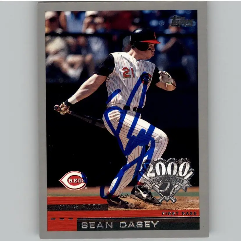 Authentic 2000 Topps Opening Day baseball card featuring Sean Casey of the Cincinnati Reds, signed boldly in blue Sharpie. A must-have for Reds fans and autograph collectors. Your purchase supports Signatures For Soldiers in aiding homeless and disabled veterans.